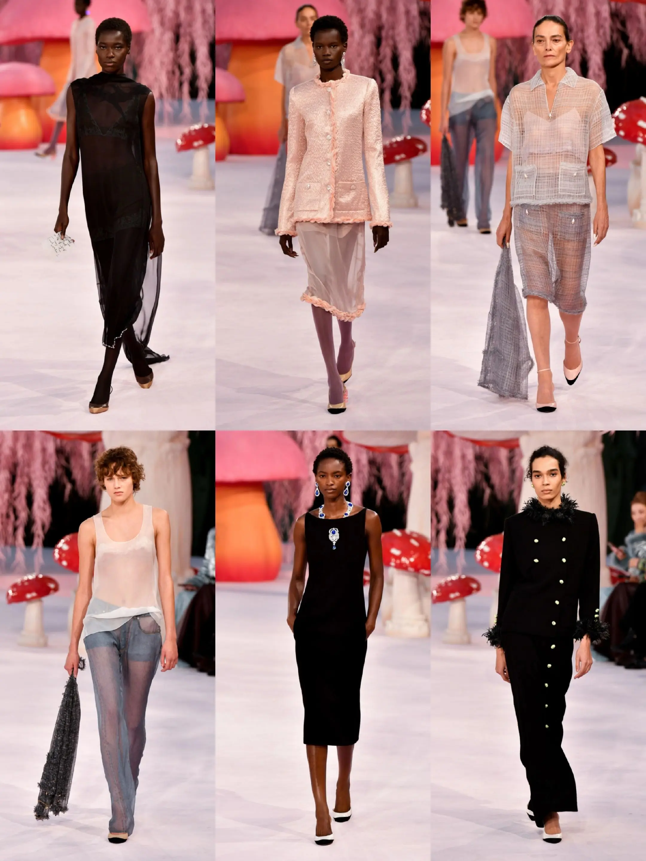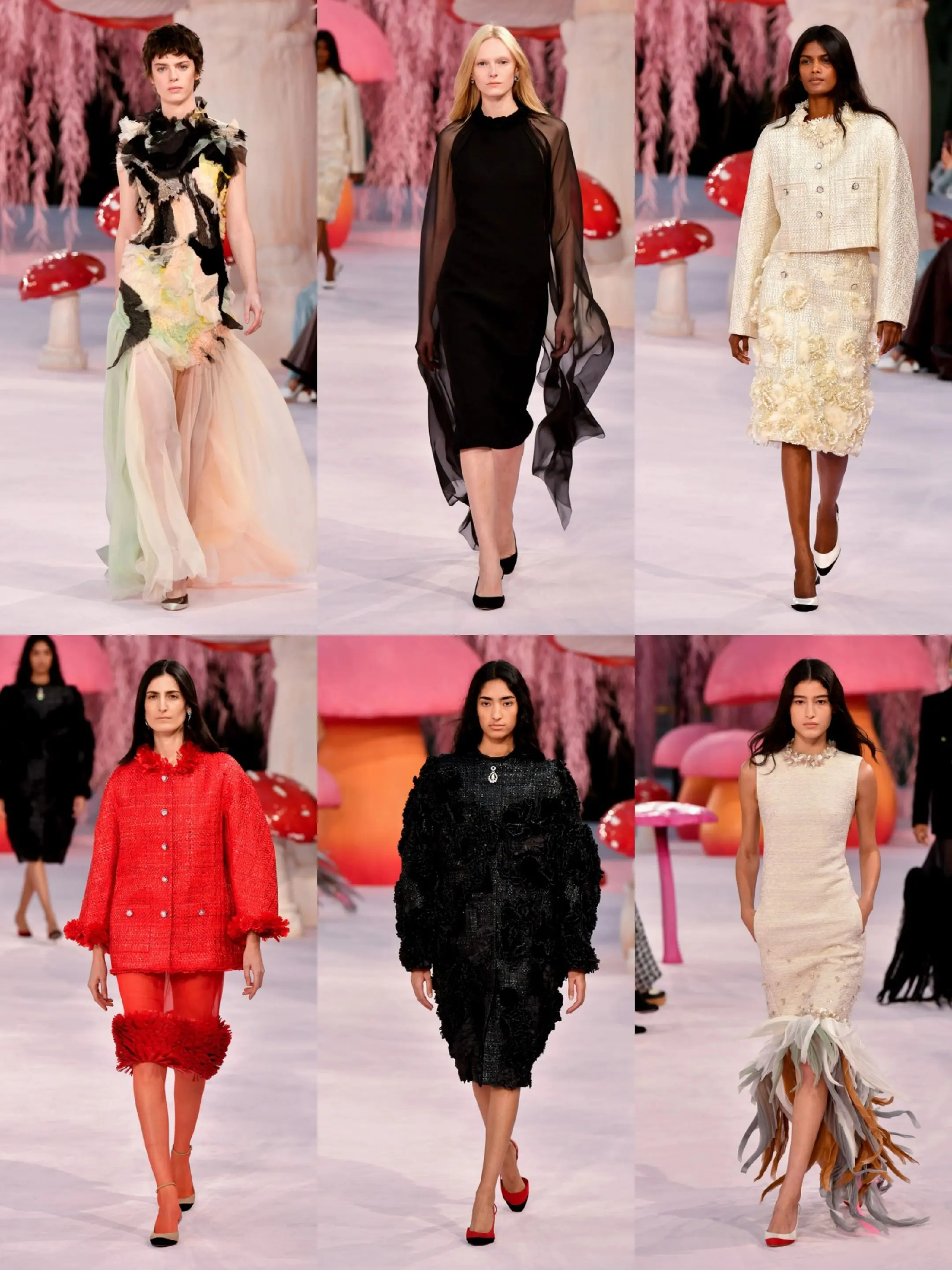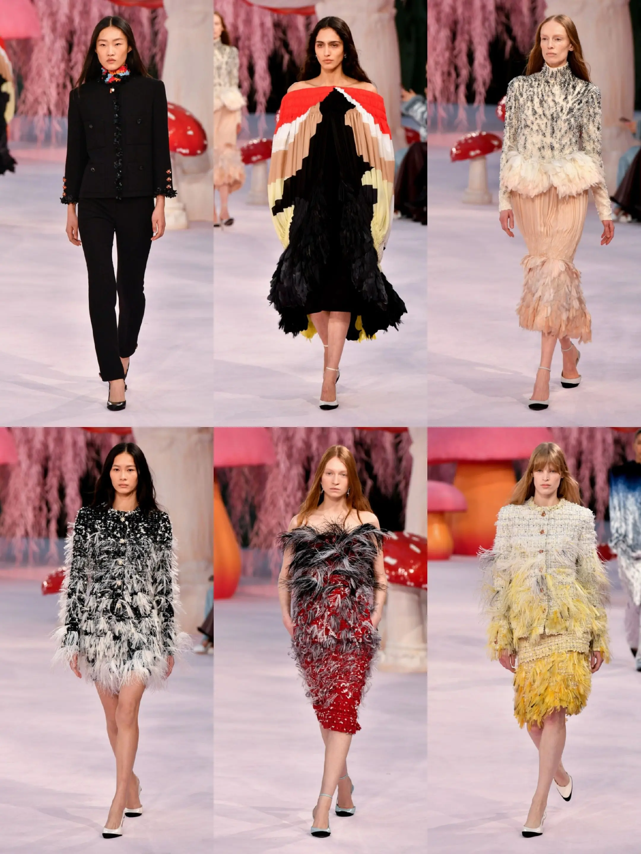Chanel Spring 2026 Haute Couture Matthieu Blazy接掌Chanel后的高定首秀,展现了一种反直觉的工艺设计哲学:以“拒绝”来重塑品牌优雅形象。 面对Le19M工坊群所拥有的庞大技艺库,Blazy并未沉迷于传统高定对繁复装饰的堆砌,而是选择通过减法触达品牌本质。 在创作流程上,他和设计团队将视线从服装本身移开,转而研究鸟类图像,工坊为此耗时三个月研发全新技术。其中最具颠覆性的创新在于对经典斜纹软呢(Tweed)的重构:工匠们并未直接使用传统羊毛面料,而是在透明编织底料上,通过Lesage刺绣工坊与Lemarié羽毛工坊的协作,利用黑白羽毛的精密刺绣模拟出粗花呢的纹理与厚度。这种“视觉欺骗”手法在保留品牌经典符号的同时,赋予了服装如羽翼般的极致轻盈。