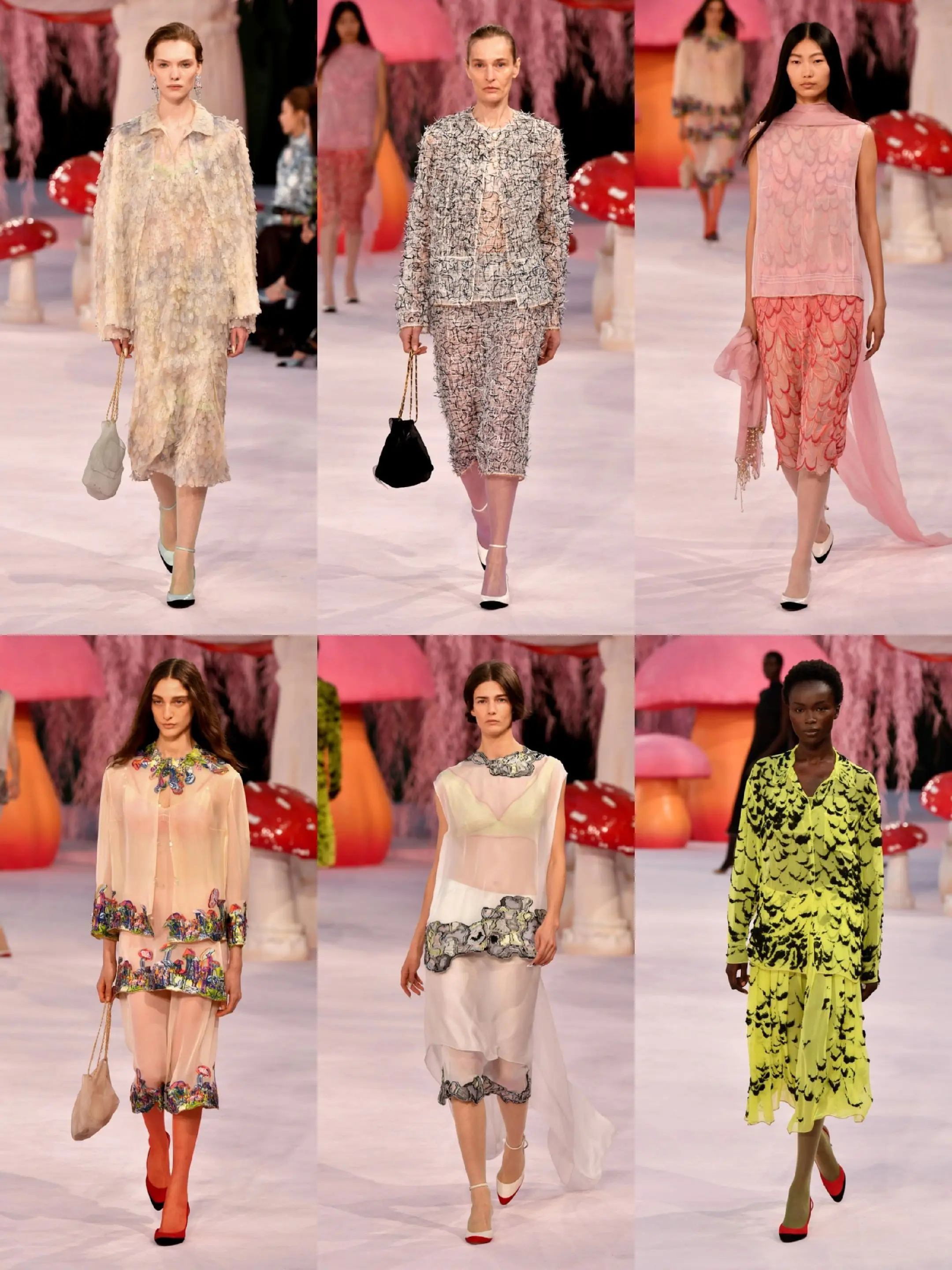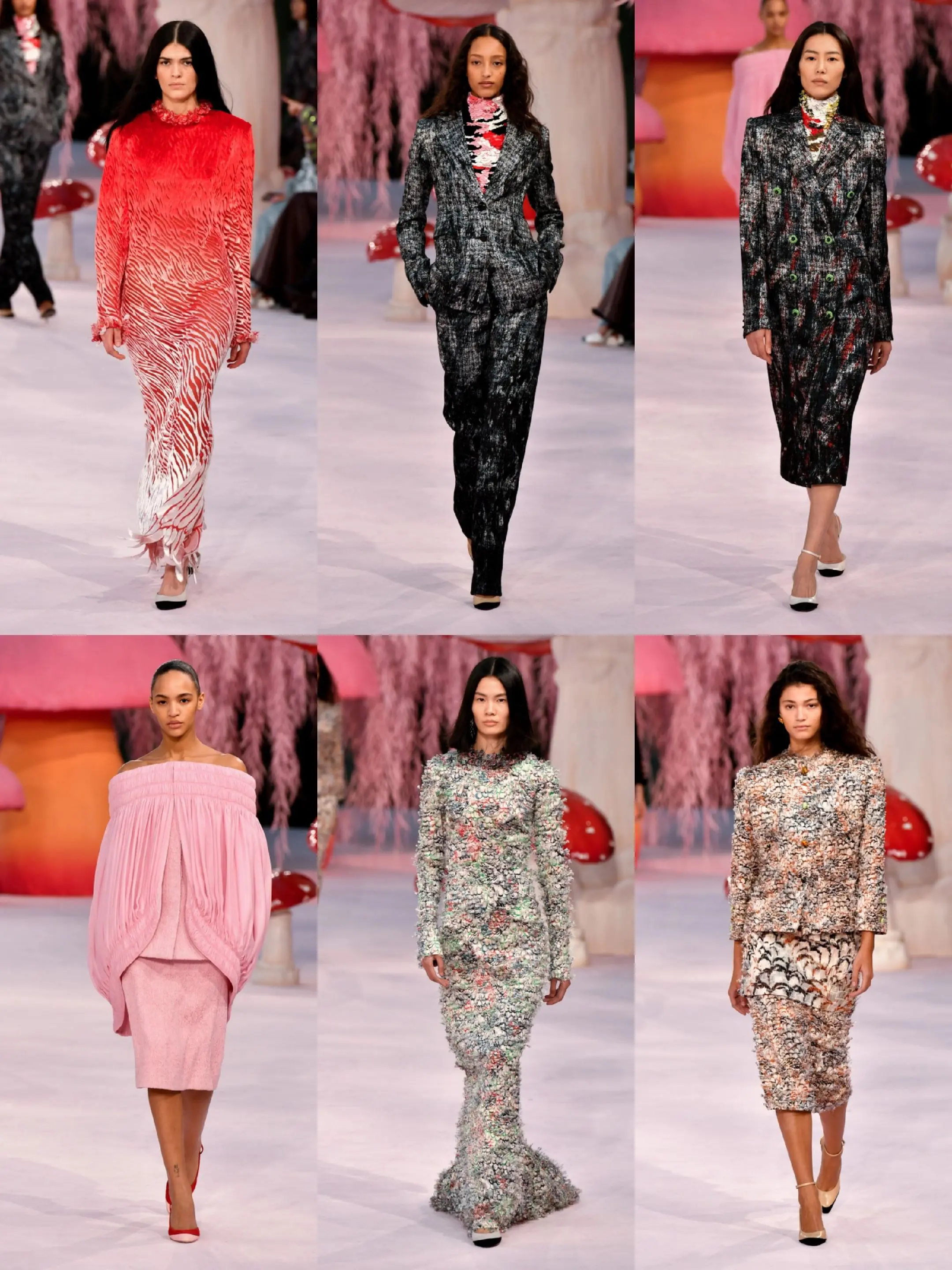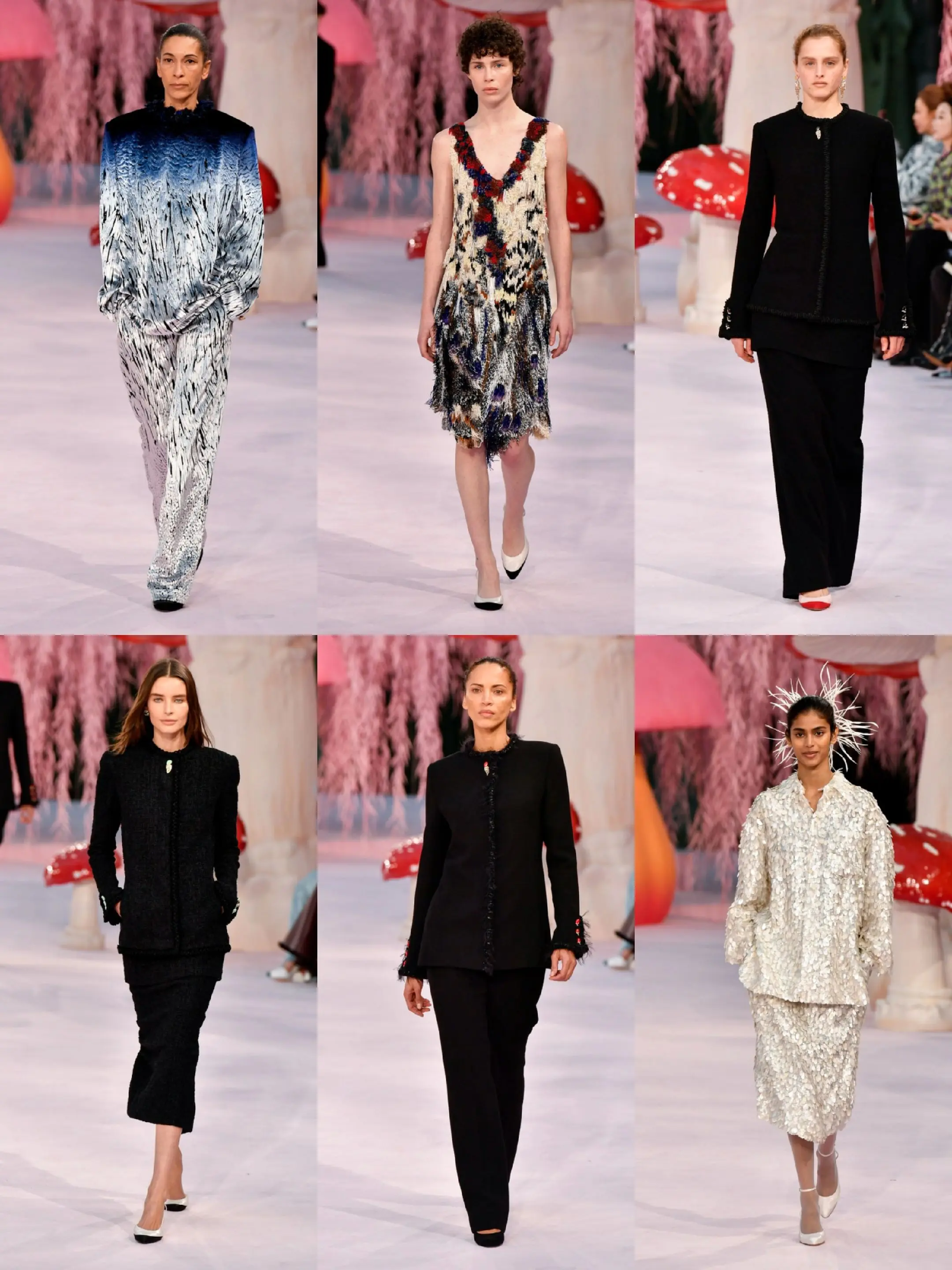 Chanel Spring 2026 Haute Couture Matthieu Blazy接掌Chanel后的高定首秀,展现了一种反直觉的工艺设计哲学:以“拒绝”来重塑品牌优雅形象。 面对Le19M工坊群所拥有的庞大技艺库,Blazy并未沉迷于传统高定对繁复装饰的堆砌,而是选择通过减法触达品牌本质。 在创作流程上,他和设计团队将视线从服装本身移开,转而研究鸟类图像,工坊为此耗时三个月研发全新技术。其中最具颠覆性的创新在于对经典斜纹软呢(Tweed)的重构:工匠们并未直接使用传统羊毛面料,而是在透明编织底料上,通过Lesage刺绣工坊与Lemarié羽毛工坊的协作,利用黑白羽毛的精密刺绣模拟出粗花呢的纹理与厚度。这种“视觉欺骗”手法在保留品牌经典符号的同时,赋予了服装如羽翼般的极致轻盈。