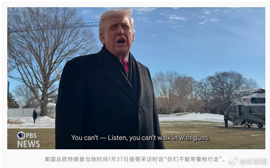 #特朗普不能带枪言论引发争议#【特朗普称“你们不能带枪”言论引发争议,美媒:他与美国拥枪权利组织决裂】据美国公共广播电视公司(PBS)报道,针对美国联邦执法人员近日枪杀一名美国男子事件,美国总统特朗普当地时间1月27日接受采访时表示,“你们不能携带枪支”。美国杂志《福布斯》称,特朗普的言论引发强烈不满,他的主张与美国拥枪权利组织决裂。据报道,PBS记者问特朗普,近日在明尼苏达州,美国公民亚历克斯·普雷蒂被联邦执法人员枪杀,普雷蒂事发时的行动“是否像一名刺客”。特朗普回答说“不”。但特朗普补充说,“你们不能拥有枪支,你们不能带着枪行走,你们不能这么做。”随后记者问及美国宪法第二修正案,该修正案允许美国公民合法持有并携带枪支。对此,特朗普重申,“你们不能带着枪行走。这是一起非常不幸的事件。”PBS称,特朗普重申了白宫的说法,即普雷蒂不应该将其合法持有的手枪带到现场。这一立场激怒了美国倡导拥枪权利组织。美国共和党一贯倡导美国公民合法拥枪,支持美国全国步枪协会等拥枪权利组织。然而,普雷蒂被枪杀事件发生后,特朗普政府官员指认普雷蒂疑似“恐怖分子”,声称联邦执法人员将其枪毙是因为他持有枪械,这种说法引发美国拥枪权利组织强烈抗议。美国拥枪者协会迅速对特朗普的最新言论做出回应。该组织说,“持枪和平抗议并非是极端的,这符合美国方式,第一修正案和第二修正案保护这些权利,而且一直会是如此。美国拥枪者协会将追究任何一届政府的责任。”另一方面,一贯反对拥枪的美国民主党则开始转发特朗普的最新言论。民主党全国委员会在社交媒体X上转发了特朗普接受采访的视频并配文:“共和党籍总统:‘你们不能拥有枪支’。”