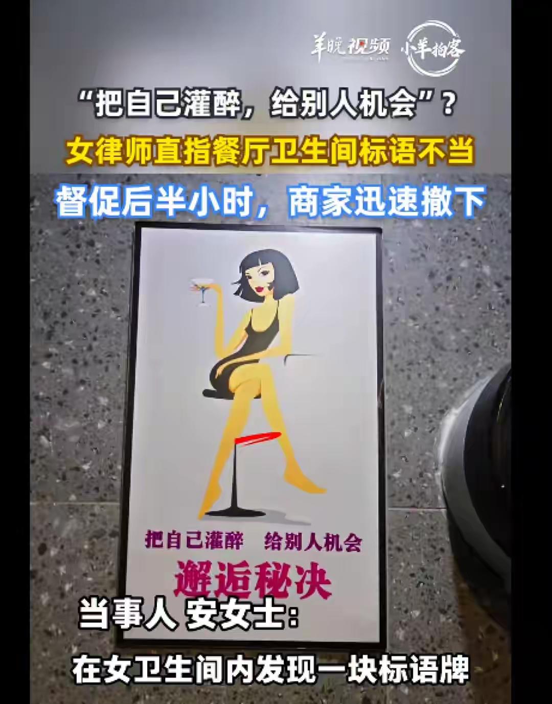 女子在餐厅女卫生间发现不当标语牌 ​1月25日,河北燕郊安女士在当地一家常去的餐厅女卫生间内,发现一块写有“把自己灌醉,给别人机会”的标语牌。 就在这普通的一天,安女士走进了她熟悉的那家餐厅,准备享受一顿温馨的午餐。然而,她的心情却在瞬间被打破——那块悬挂在女卫生间里的标语牌,像一记重锤,狠狠地击中了她的内心。上面赫然写着:“把自己灌醉,给别人机会。”这短短几字,似乎在无声中告诉每一个经过这里的女性:你的自我价值、你的尊严,似乎都可以被轻描淡写地用一句话“合理化”。 这不是个别的误会,也不是简单的标语错误,而是一种令人深思的社会现象:在一些地方,女性的自我认知和尊重似乎还没有得到应有的重视。为什么会出现这样令人震惊的标语?背后反映的是某些人对女性的偏见和误解,甚至是对自我价值的扭曲。 但更令人愤怒的是,这样的标语竟然还能存在于公共场所!它暴露出我们社会在性别平等、尊重女性方面依然存在的巨大差距。难道我们要让这样的“思想毒药”继续影响更多人吗?难道我们要让女性在潜移默化中接受“自我牺牲”、“自我贬低”的价值观吗? 其实,这样的事件也让我们看到了一个深层次的问题:我们每个人都应当成为自己价值的守护者。不是靠“灌醉”来“给别人机会”,而是要学会尊重自己,懂得拒绝那些试图剥夺我们尊严的言语和行为。每个女性都值得被善待、被尊重,而不是被灌输“自我牺牲”的错误观念。 这件事引发了网友们的广泛关注和热烈讨论。有的人愤怒,有的人反思,有的人开始自我检讨:我们是不是太过容忍了?是不是太过习惯了那些潜移默化的“灰色地带”?其实,改变从我们自己开始。我们要用行动告诉社会:尊重女性,就是尊重我们自己。我们要勇敢发声,拒绝任何形式的歧视和偏见。 或许,那个“灌醉”的标语牌只是一个极端的例子,但它折射出的问题却是真实存在的。每一次的曝光,都是一次警醒。我们需要更多的声音去呼吁平等、尊重和理解。让我们共同努力,让每个公共场所都成为传递正能量的阵地,让女性在这个社会中不再被标签、被误解、被伤害。 因为,尊重女性,就是尊重未来的自己。让我们从关注一块标语牌开始,唤醒社会的良知,点亮每一个被忽视的角落。唯有如此,我们才能迎来一个真正平等、温暖的社会。标语