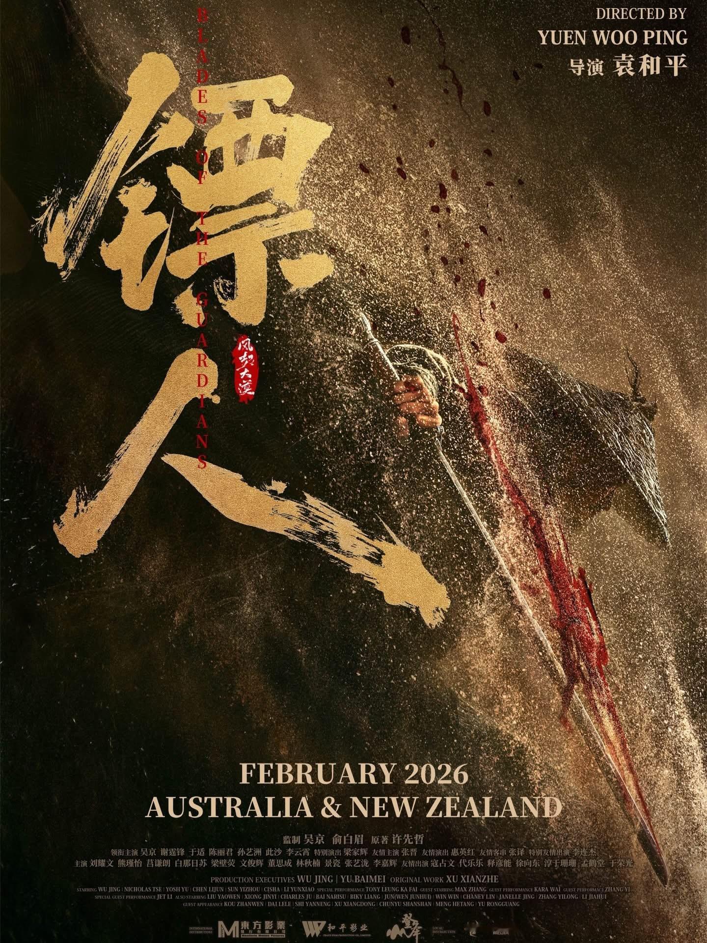 【资讯:电影镖人多国定档 】袁和平执导,吴京、俞白眉监制,俞白眉、苏照彬、陈大利、杨子编剧,吴京、谢霆锋、于适、陈丽君、孙艺洲、此沙、李云霄领衔主演,梁家辉特别演出,张晋友情主演,惠英红友情演出,张译友情客串,李连杰特别友情出演,刘耀文、熊瑾怡、莒谦朗、白那日苏、梁壁荧、文俊辉、董思成、林秋楠、景瓷、张艺泷、李嘉辉主演,寇占文、代乐乐、释彦能、徐向东、淳于珊珊、孟鹤堂、于荣光友情出演的古装武侠片《电影镖人 :风起大漠/BLADES OF THE GUARDIANS》于02月17日北美公映(美国、加拿大),由Well Go USA发行,于02月19日澳大利亚、新西兰公映,由Niu Vision发行。中国🇨🇳、马来西亚🇲🇾、新加坡🇸🇬、美国🇺🇸、加拿大🇨🇦:02月17日澳大利亚🇦🇺、新西兰🇳🇿:02月19日