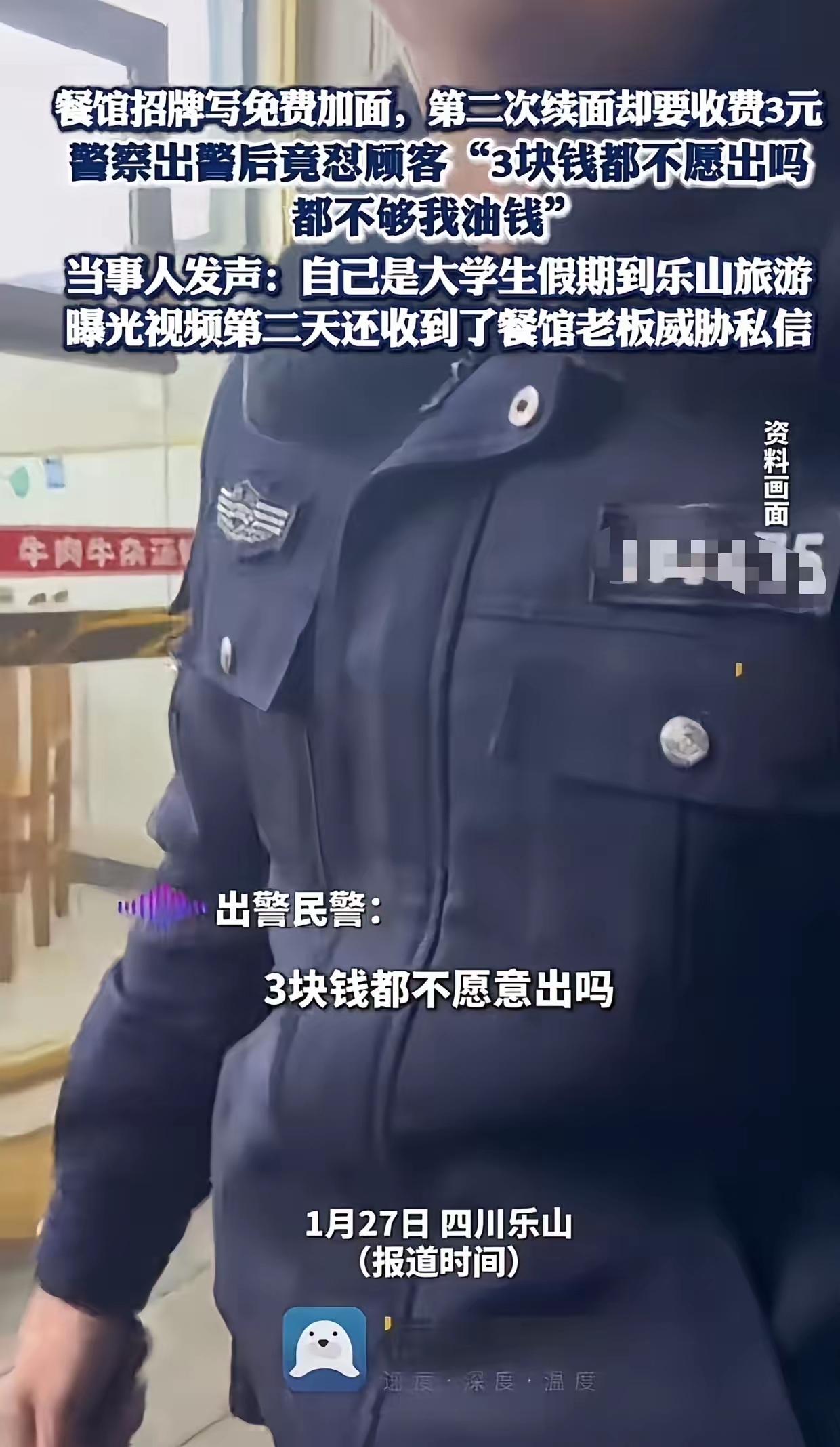 “乐山摊上大事了!”大学生去吃面,面馆招牌写免费加面,可他第二次续面却要收费3元!大学生不服,可民警来了以后,居然帮着老板怼大学生:“你3块钱都不愿出吗?这点钱还不够我开到这里的油漆!” 大学生当场就懵了,指着门口的招牌跟民警理论,说老板明着写免费加面,转头又收钱,这就是不讲诚信,不是钱的事,是理不对。 老板也一肚子火,说免费加面是给正常吃饭的人,这大学生一碗面续了两次,明显是占便宜,做生意总不能被人这么薅羊毛。 周围围观的路人吵成一团,有人觉得大学生较真,3块钱没必要揪着不放,也有人说老板既然标了免费,就该说到做到,不能看人下菜碟。 大学生觉得自己没错,维权不是抠门,商家的承诺就该算数,民警的话偏帮着老板,让他心里特别委屈,感觉自己的合理诉求没被重视。 老板倒觉得民警说的在理,小本生意赚的都是辛苦钱,免费加面是人情,不是义务,总不能因为一句标语,就让自己亏本做生意。 这事越传越开,有人说大学生太年轻不懂社会人情,也有人吐槽商家出尔反尔,连带着民警的一句话,也成了大家争论的焦点。 其实说到底,不过是一碗面的小事,可偏偏卡在了诚信和人情的中间,各有各的理,却没人愿意退一步,小事才闹得沸沸扬扬。 小生意讲规矩也讲人情,消费者守权益也懂体谅,少点较真的执念,多点互相理解,哪会因为3块钱,闹得满城风雨。