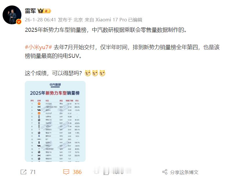 哈哈……雷军又凡尔赛了!1、小米SU7是新势力年度销量排名第一的车型;2、小米YU7仅用半年的时间就成为新势力单品销量第四的车型。同时也是纯电销量最高的SUV。PS:于是雷军问这个成绩可以得瑟吗?雷军回应小米SU7保值率第一名
