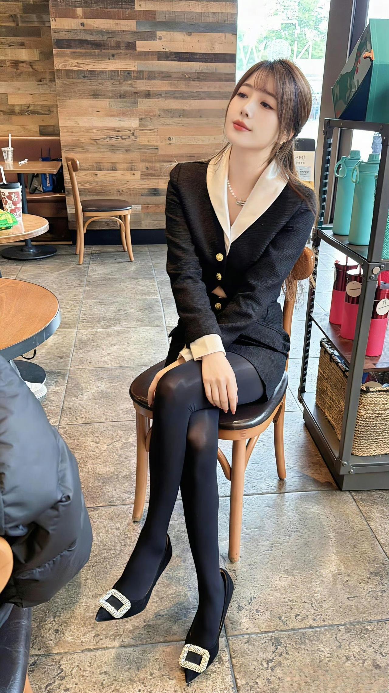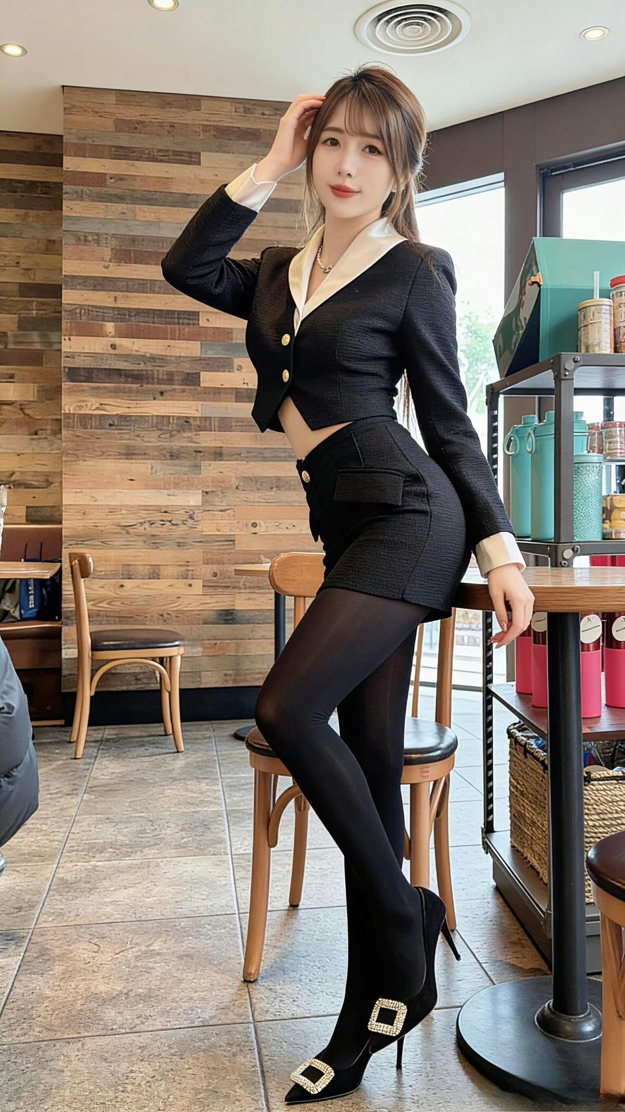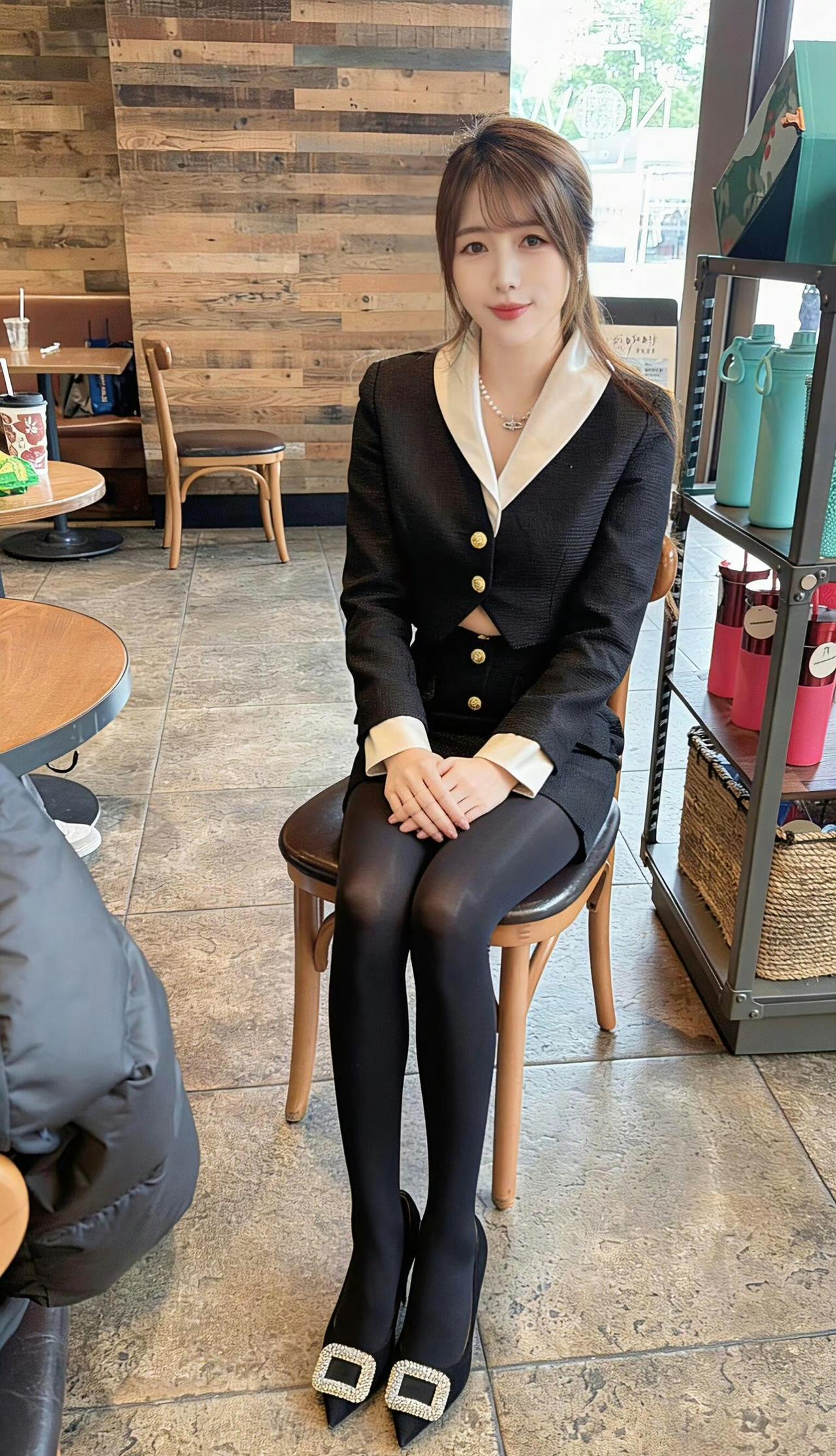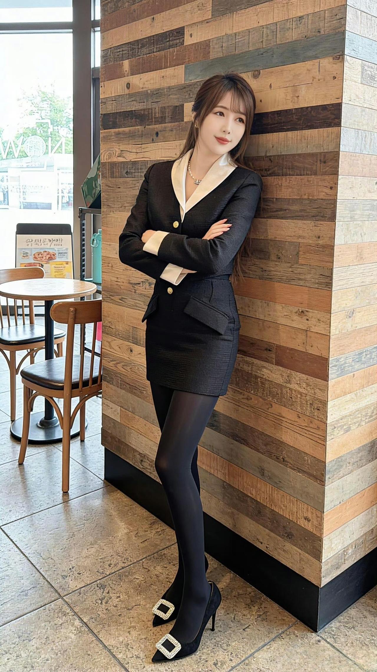 这套穿搭是干练的黑白职业装,把职场利落感与精致细节融合。黑底白边西装套装自带干练气场,撞色领+金属扣添轻奢精致感;短裙版型注轻熟感。 ​ 搭配钻扣高跟鞋强化精致质感,珍珠项链提升轻奢氛围,和木质纹理的室内环境高度契合。充分展现穿着者干练轻奢的轻熟魅力。西装套装女黑色 职业裙西装套装 时尚女职场套装 职业装套装