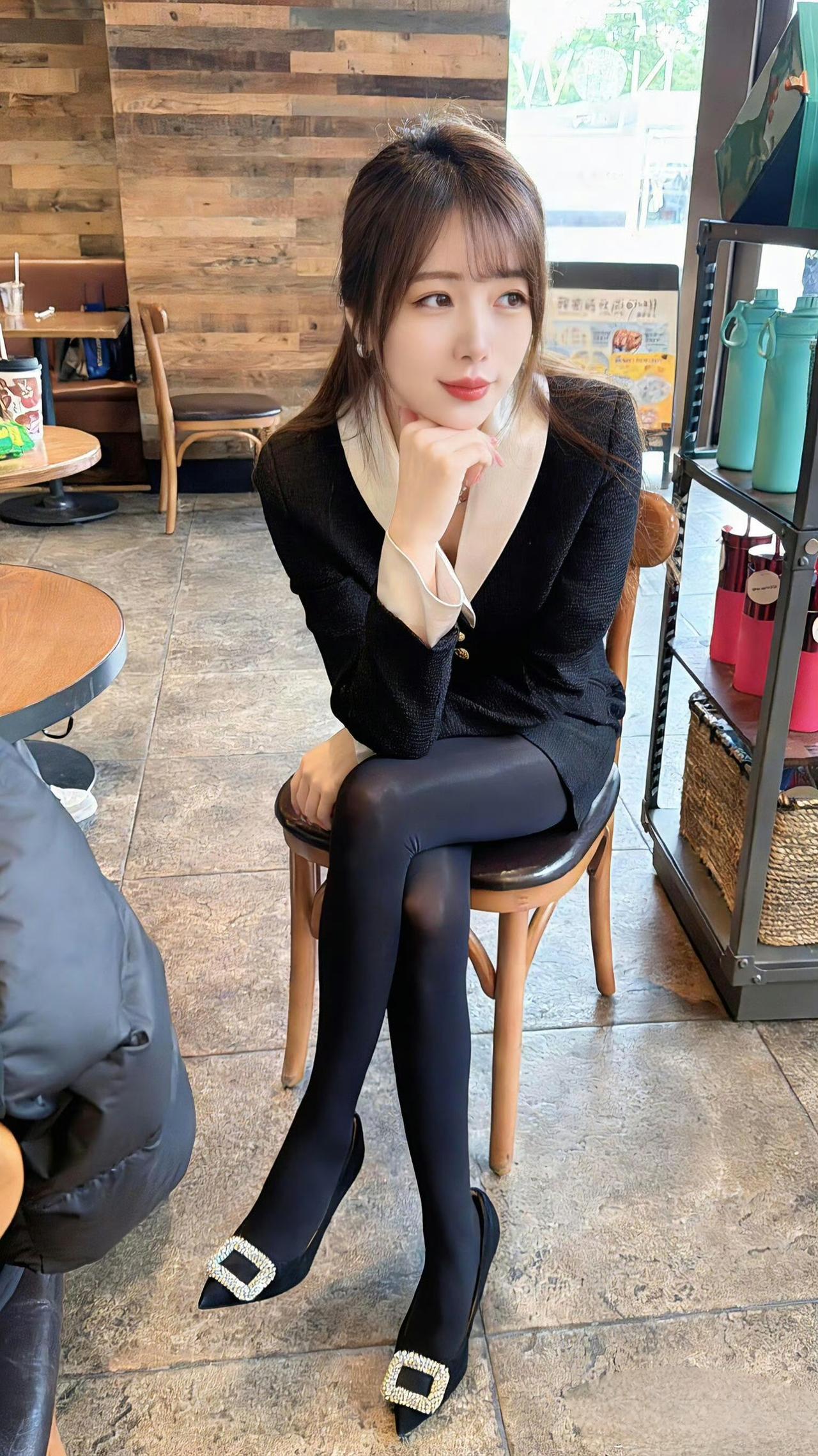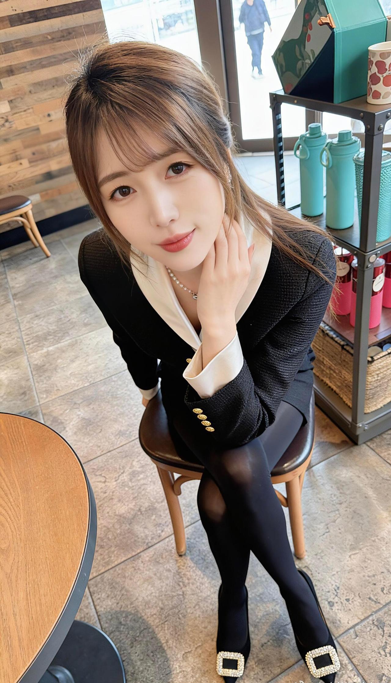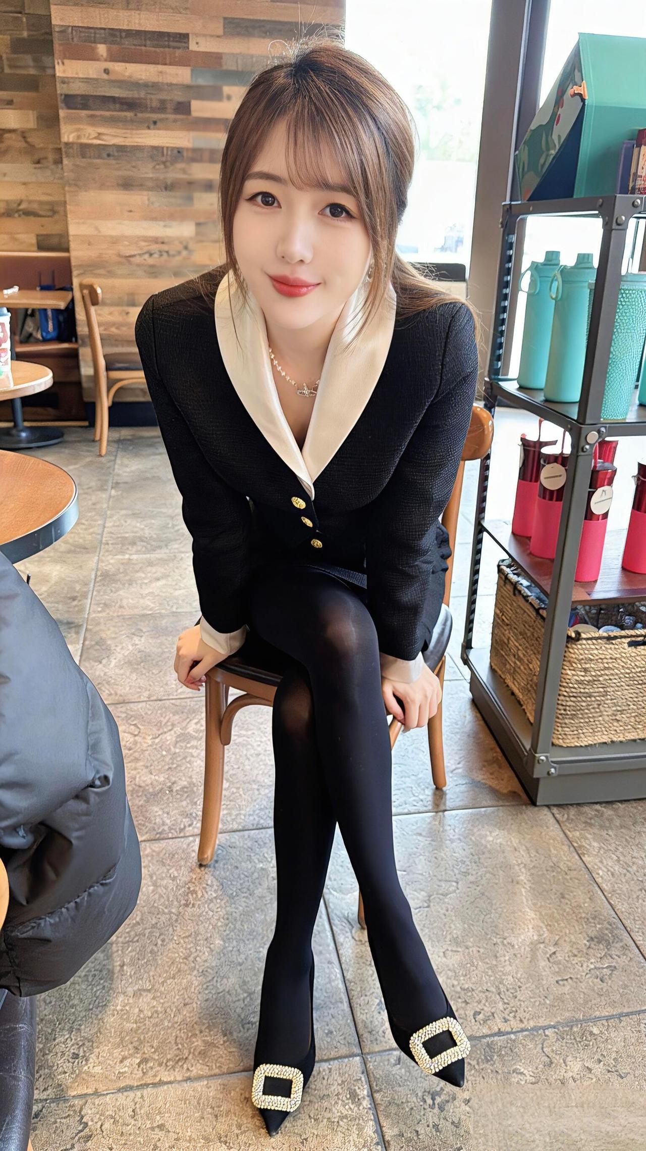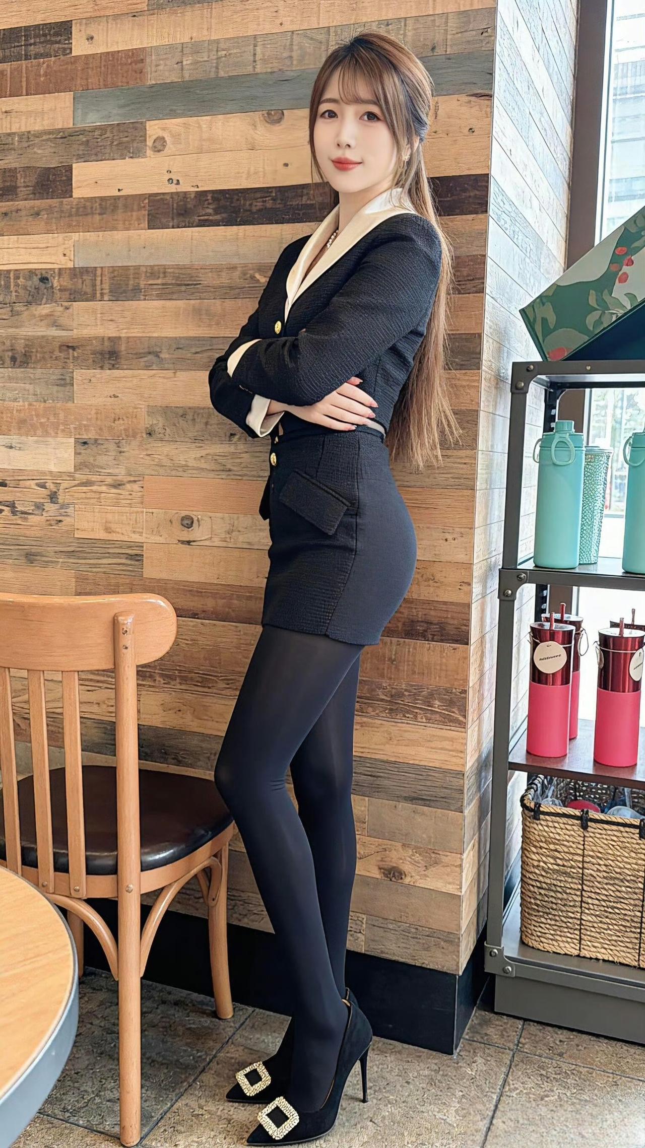 这套穿搭是干练的黑白职业装,把职场利落感与精致细节融合。黑底白边西装套装自带干练气场,撞色领+金属扣添轻奢精致感;短裙版型注轻熟感。 ​ 搭配钻扣高跟鞋强化精致质感,珍珠项链提升轻奢氛围,和木质纹理的室内环境高度契合。充分展现穿着者干练轻奢的轻熟魅力。西装套装女黑色 职业裙西装套装 时尚女职场套装 职业装套装