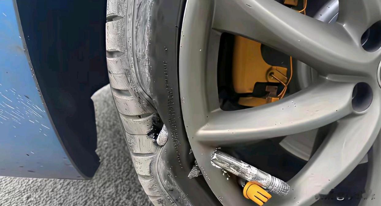 这是什么钉子连轮毂都捅穿了