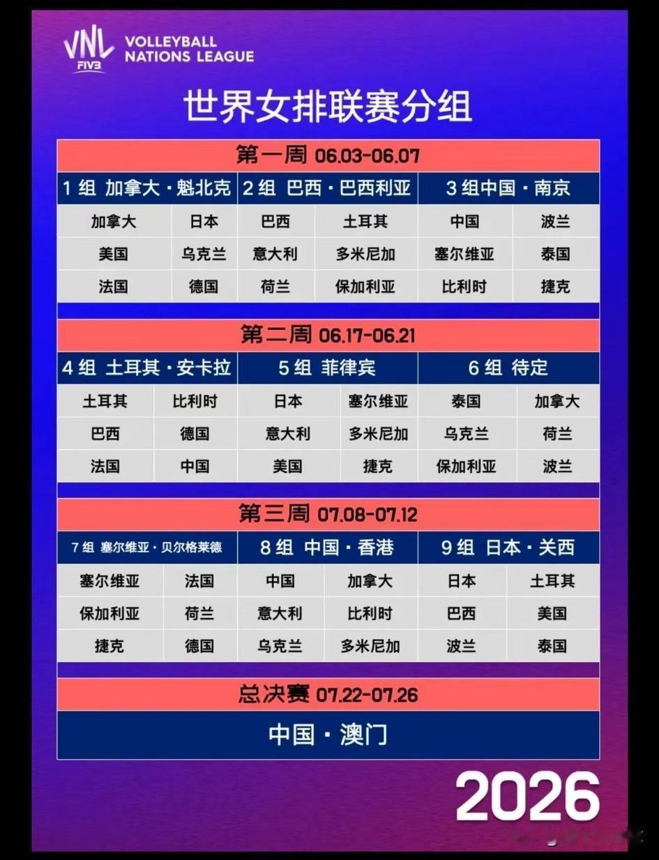 细数盘点女排世联赛分组,亚洲最大的对手日本看来又要避过了! 只要等到亚锦赛去碰撞了,去检验了! 目前中国女排所在的分站有南京、香港、土耳其安卡拉! 目前小编定居在南京,南京的分站赛好歹要去现场观看,正好离家门口也不太远。 南京站作为第一站,也就塞尔维亚和波兰两支强队,但是捷克和比利时这两支球队也不可小觑。 不过首站像博斯科维奇大牌球星应该会缺席! 第二站土耳其安卡拉 土耳其、巴西和法国,中国女排不一定都能碰到!对于法国女排,中国女排能成功复仇吗?巴西这两年都没碰到这支球队了! 第三站香港 也就意大利最强! 至于中国男排没啥想法,总决赛落户宁波。作为东道主,哪怕打得再烂也能进总决赛。