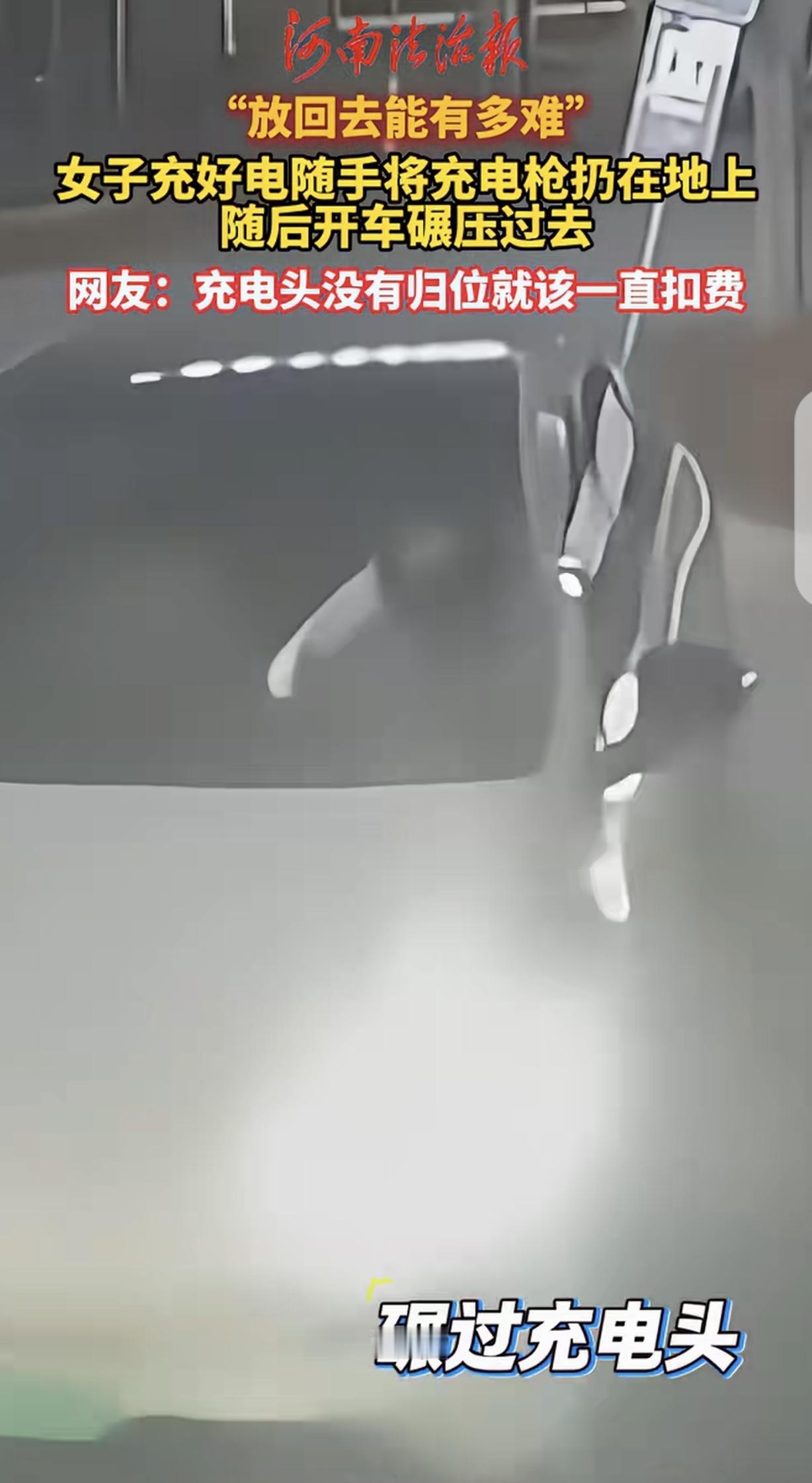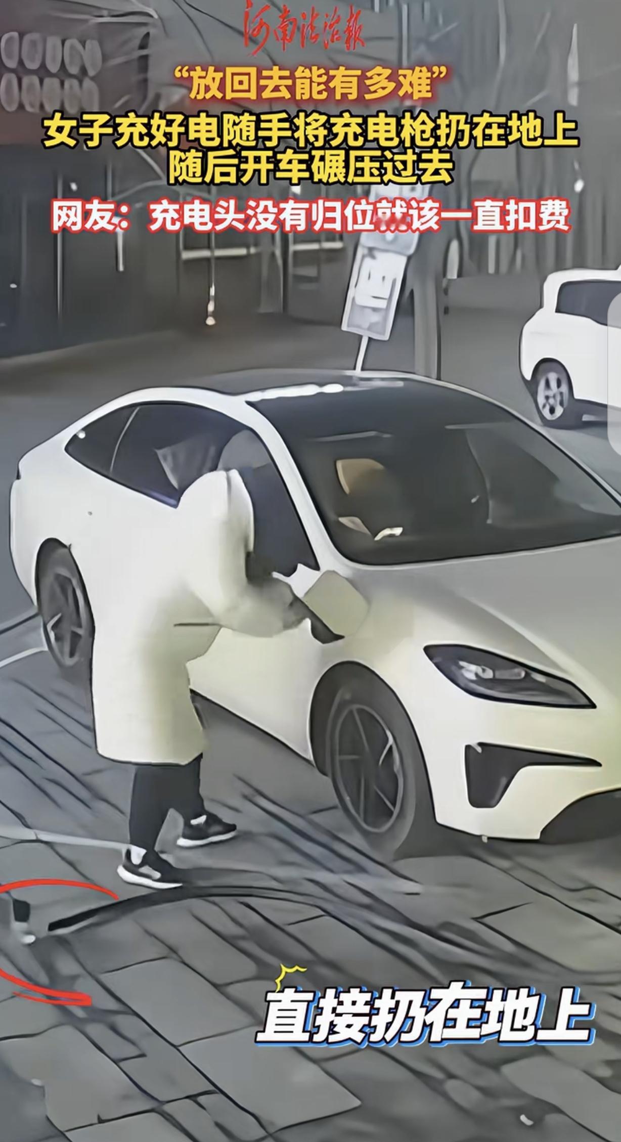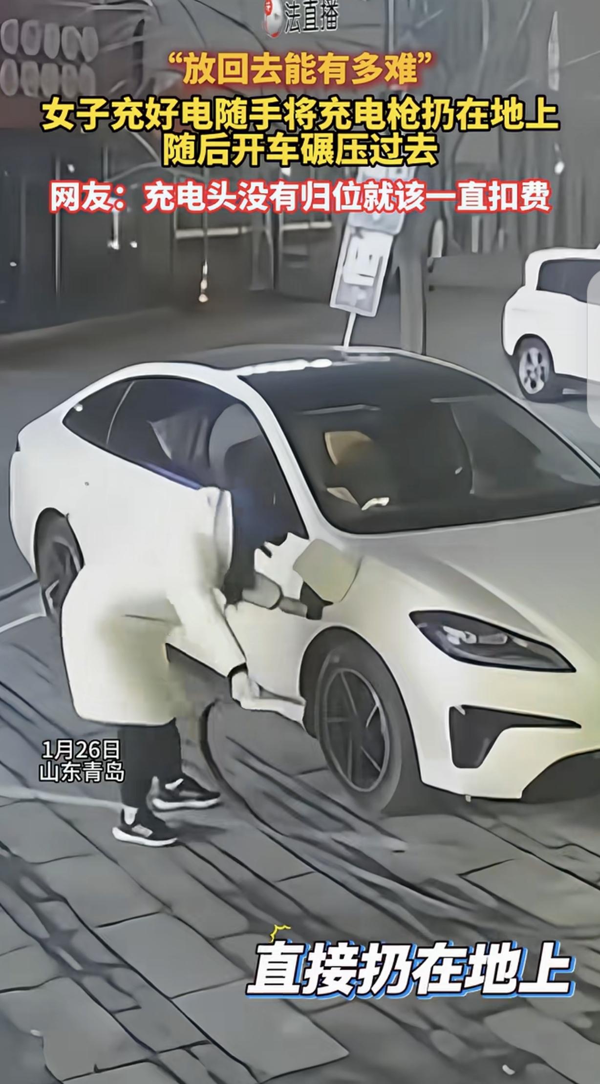 过分了!山东青岛,一公用充电桩前,一女子使用充电枪给她的车充电,这一般人来说,充完电后都会把充电枪放回充电桩,但女子却不一样,使用完充电枪充电后,她竟随手就将充电枪扔在了地上。更是让人没想到的是,随即女子驾车离开时,又直接开车从充电枪上碾压了过去。看这情况,估计这个充电枪是废了。   视频中的女子身着整洁衣物,开着一辆豪车,外在的光鲜亮丽,却难掩内里的自私与粗鄙。   她驾驶新能源汽车到公用充电桩完成充电后,没有像大多数人那样随手将充电枪归位,反而漫不经心地一把扯下,随手丢在冰冷的水泥地上,动作随意得仿佛丢弃的不是公共财物,只是一件毫无价值的垃圾。   充电枪重重砸落地面,连带线缆散乱地拖在一旁,女子对此视若无睹,转身便拉开车门坐进驾驶位。   更让人没想到的是,随即女子驾车离开时,又直接开车从充电枪上碾压了过去。   整个过程中,她脸上没有丝毫愧疚,眼神里满是漠然,那份对公共资源的轻贱,隔着屏幕都令人心生愤懑。   这一幕被网友曝光后,迅速引发全网热议,成为公众热议的焦点。   公用充电桩本是为方便所有新能源车主设置的公共设施,维系其正常运转,全靠每个使用者的自觉。   一把充电枪的损坏,看似是小事,却会引发一系列连锁反应。   对充电站运营方而言,每一把快充充电枪的维修成本都在一千元左右,人为造成的损坏,最终都会转化为运营成本的增加,这些成本本质上还是由所有使用者间接承担。   对后续有充电需求的车主来说,损坏的充电桩会直接耽误出行计划,尤其是遇到急事需要补电时,这种人为造成的不便,更显可恶。   除此之外,被随意丢弃的充电枪还藏着不小的安全隐患,暴露在外的枪头和线缆,若遇到雨雪天气容易进水结冰,不仅会缩短设备使用寿命,还可能导致线路故障、漏电等问题,给后续使用者的人身和车辆安全带来威胁。 另外,涉事女子不仅缺乏基本的公共道德,更没有敬畏法律的意识,她的行为不仅违背公序良俗,更涉嫌故意损坏公共财物,已然触碰了规则底线。   这种行为绝非偶然,更像是个人本性的自然流露,不难预判,这样的人在生活其他方面,也大概率会表现出骄横跋扈、只图自身便利的特质,全然不顾及他人感受。   而从管理层面来讲,部分充电站的文明提示贴在不显眼位置,缺乏足够的警示效果,同时对损坏设备的行为,没有健全的追责处罚机制,这也让一些人更加有恃无恐。   面对这样的行为,绝不能纵容姑息,必须拿出切实有效的应对办法。   监管部门应主动介入,对这类故意损坏公共设施的行为依法追责,要求涉事者承担全额维修费用,必要时处以罚款,以法律的约束力敲响警钟。   充电站运营方可进一步优化管理,一方面对设备进行技术改造,比如采用插卡充电模式,若充电枪未归位则无法拔卡且持续扣费,用利益杠杆约束使用者行为;   另一方面建立黑名单制度,将多次损坏设备、恶意丢弃充电枪的车主纳入其中,限制其使用公共充电资源。   素质从来不是靠衣着打扮堆砌的,也和车辆档次无关。   外在再光鲜,若行事毫无底线,漠视公共利益,终究只会暴露内心的低劣。   公用设施是社会共同的财富,需要每个人用心呵护,唯有人人坚守自觉,才能让公共资源真正服务于每一个人,让出行少一些不必要的阻碍,多一份顺畅与安心。   今天的分享到这里就结束了,大家对此事有何看法,欢迎在评论区留言和讨论,感兴趣的可以点击头像加关注,我将每日更新优质内容,我们下期见。