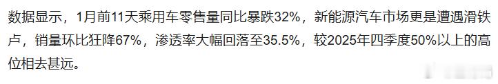 上周(1月19日-1月25日)据说头部新势力的订单都栽了,几个顶流小鹏(7900)、零跑(6300)、理想(5200)、蔚来(4100)更重要的是,乘联会此前公布了1月份1日-18日的数据,整个新能源市场几乎腰斩,并且新车渗透率从上个月接近60%到刚过40%,也就是说一月份电车还没卖过油车,你觉得除了政策原因(购置税退坡)之外,还有什么原因造成了两个月数据差距如此之远...