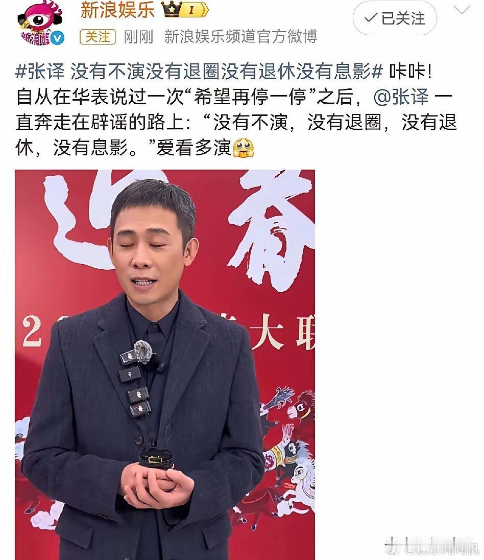 张译,太刚了!1月27日,张译突然冲上了热搜,因为接受采访时,他不留任何余地,直接把话说死:“没有不演,没有退圈,没有退休,没有息影!” 起因是去年4月华表奖上,他的一句“想停一停”,至此他就没停下辟谣的脚步,毕竟这9个月的“消失”实在太让人猜不透了。其实张译根本没有退圈,而是给自己放了个假。作为华表奖史上首个二封影帝的演员,之前几年他作品密到自己都“演烦了”,怕套路化表演对不起观众,才果断按下暂停键。在这9个月里,张译彻底淡出镜头,不接综艺不代言,反而揣着零钱逛早市,跟摊主聊猪肉涨价,穿几百块的卫衣买菜,租5000块以内的出租屋,陪着猫咪过起了普通人的日子。谣言越传越凶的时候,官媒直接高调官宣打脸,张艺谋执导的国安题材新片《惊蛰无声》定档春节,张译友情出演的名字赫然在列。要知道这部片可是国家安全部指导的硬题材,搭档易烊千玺、朱一龙等实力派,他甘愿“降番”演配角,就是因为剧中角色让他心动了。你喜欢张译的角色吗?