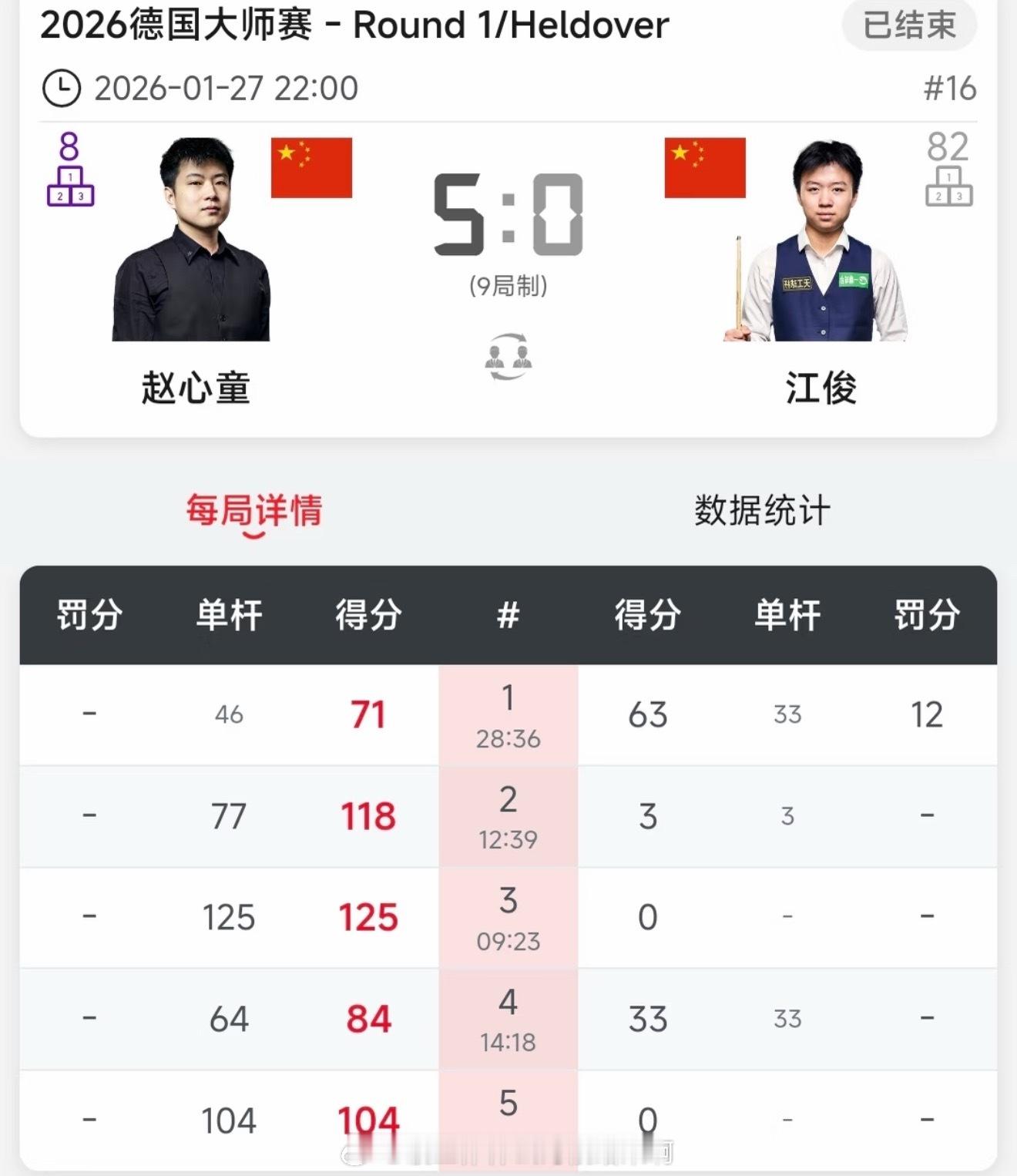 📢赵心童晋级德国大师赛32强📍『2026斯诺克德国大师赛』 64 进 32 强🎱赵心童 5-0 江俊赵心童5比0江俊