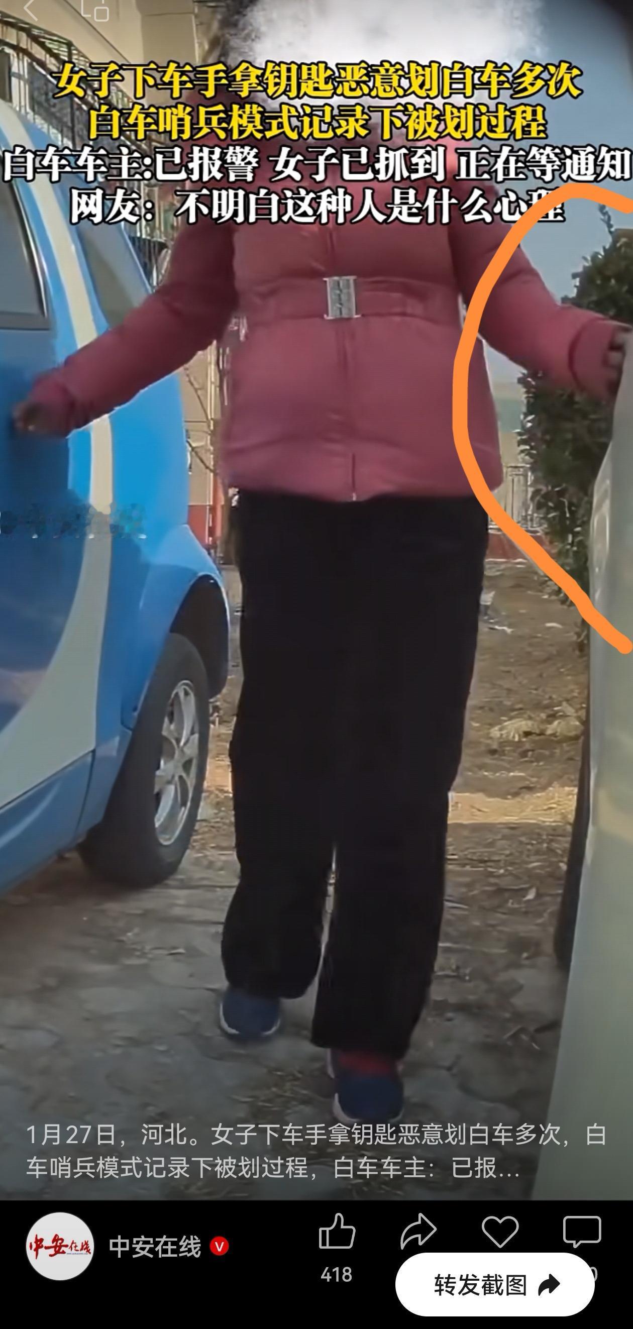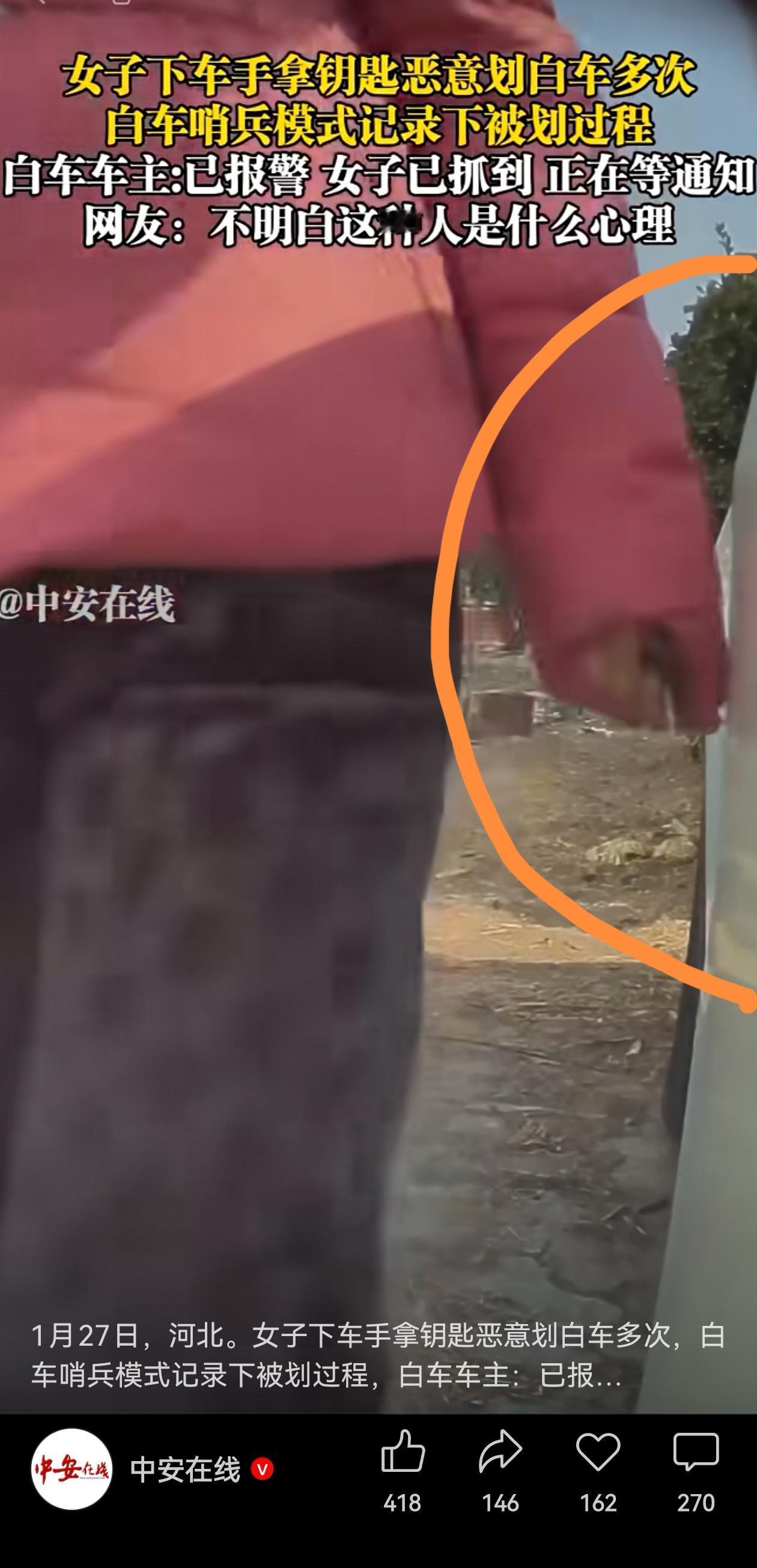 谁懂啊?2026年1月27日河北,一女司机从自己车上下来,手持钥匙,在关自己的车门时,反复划蹭相邻白色汽车,一下又一下,动作刻意且连续。 哪知道划车全程被白车“哨兵模式”清清楚楚地完整记录下来。白车车主调取录像后,立即报警,这位女子司机也很快被抓。 谁懂啊?自己也是开车的人,明明最该懂车被划的心疼和修车的麻烦,却故意对别人的车下狠手。这可不是“冲动”,纯粹是坏吧? “哨兵模式”这次立了大功。以前很多划车案成了无头公案,周围没有监控,车主只能自认倒霉。 这次“哨兵模式”提供了完整的证据链,警方一抓一个准,女司机以为自己动作隐蔽,边划还边关自己的车门,以为没人看见? “哨兵模式”这双眼睛,亮着呢。 最让人无语的是“害人不利己”啊!她划这几下,自己的保险公司会赔偿吗?估计要自己掏钱修车了吧?损人八百,自损一千,这笔账怎么算都是愚蠢透顶。 少一点这种让人无语的事情吧,期待警方依法处理结果,大家都是司机,找车位不容易,小剐小蹭谁不心疼呢?谁懂啊? 信息来源:中安在线