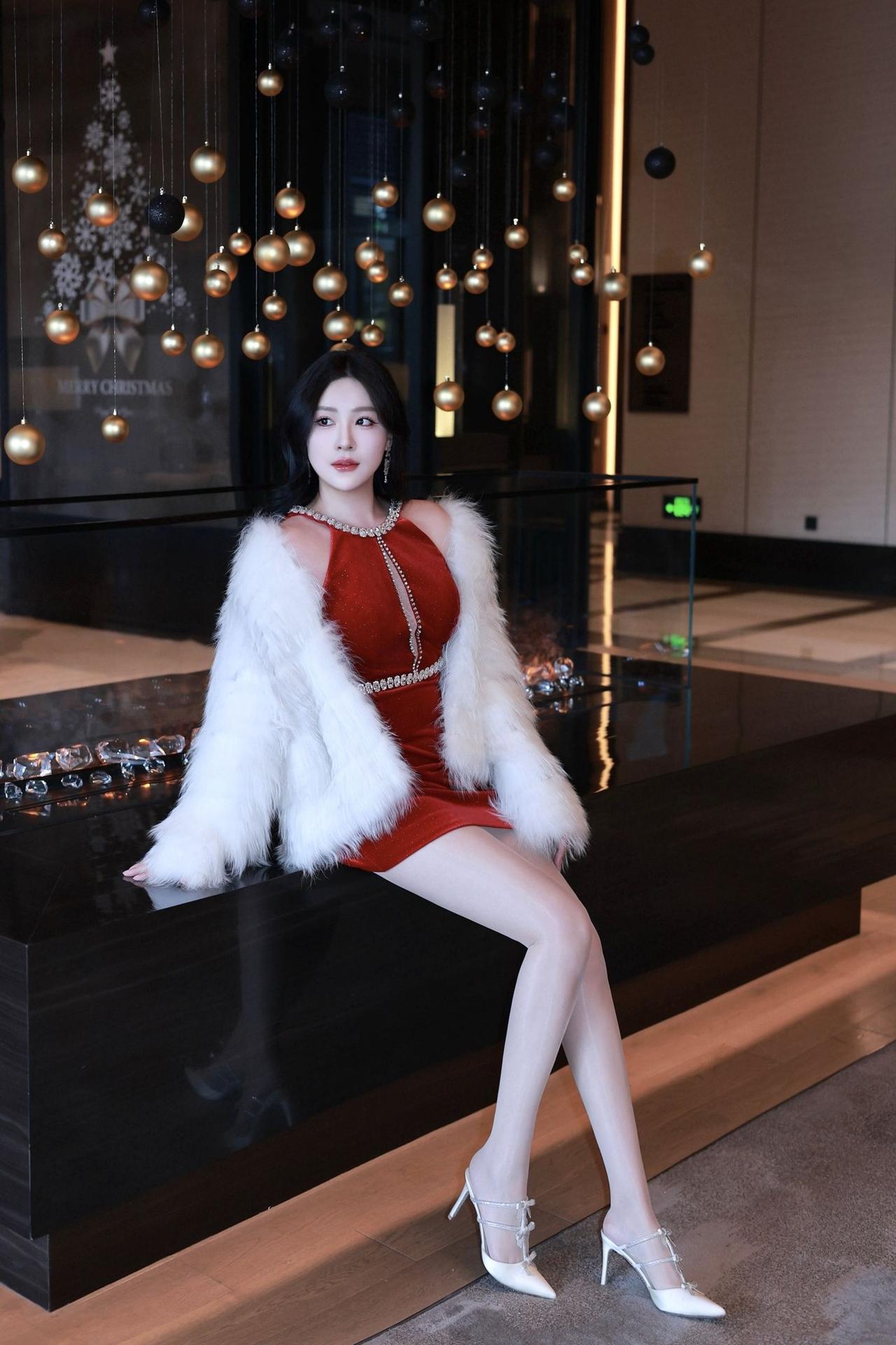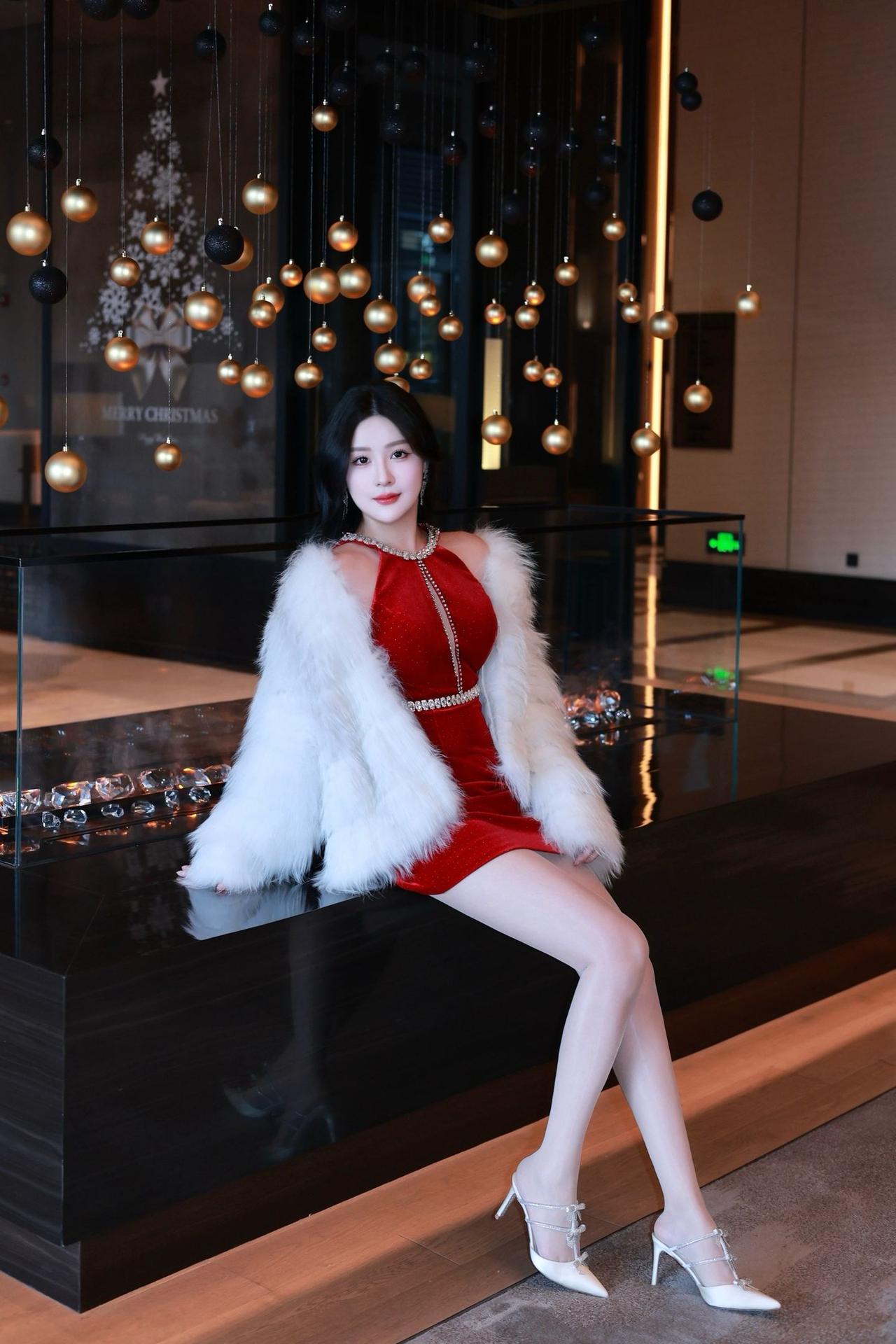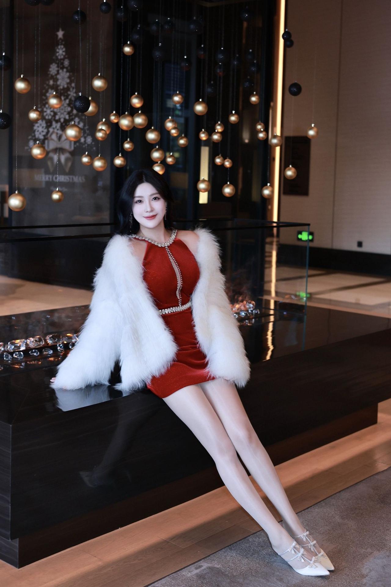 红色丝绒连衣裙搭配白色毛绒外套,温柔又时尚!
