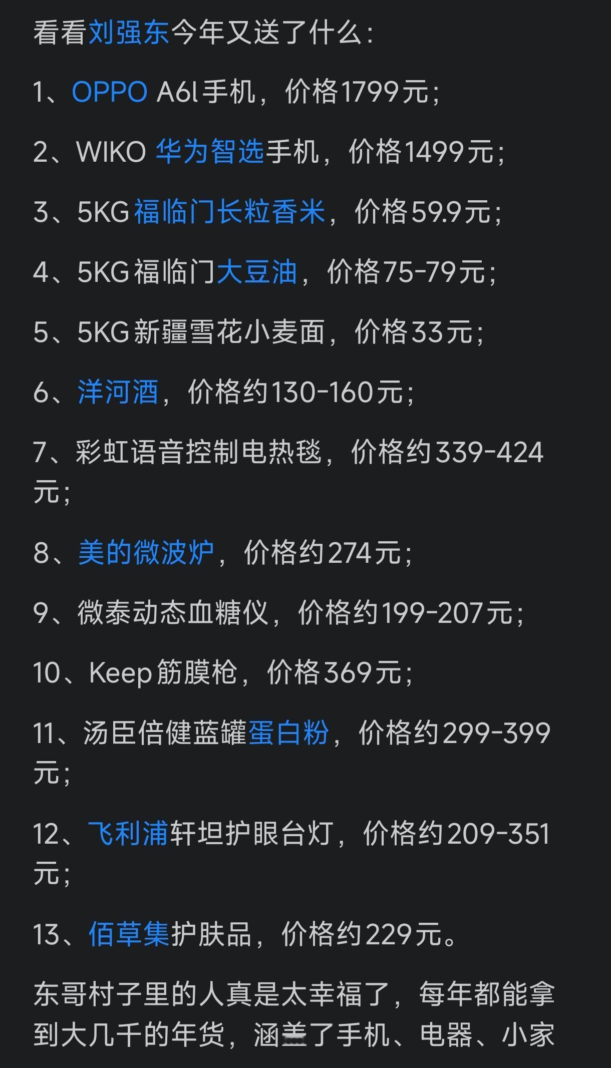 原本我以为刘强东今年给老家光明村乡亲发的年货都是自家公司卖不出去的尾货,可是我细