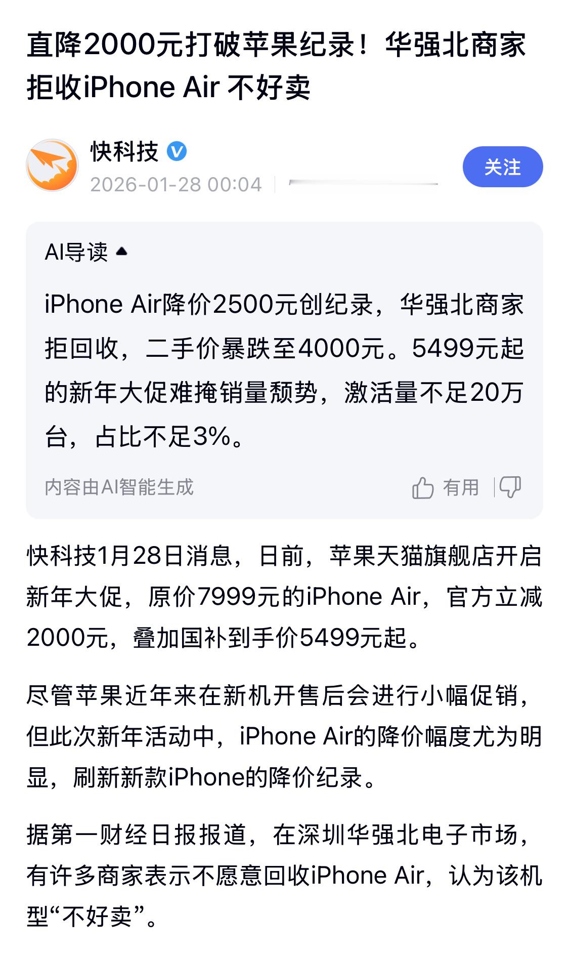 华强北商家拒收iPhoneAir现在有点明白为什么机圈没人敢创新了,代价太大,强如苹果也会翻车,换其他品牌这波可能就是元气大伤了。