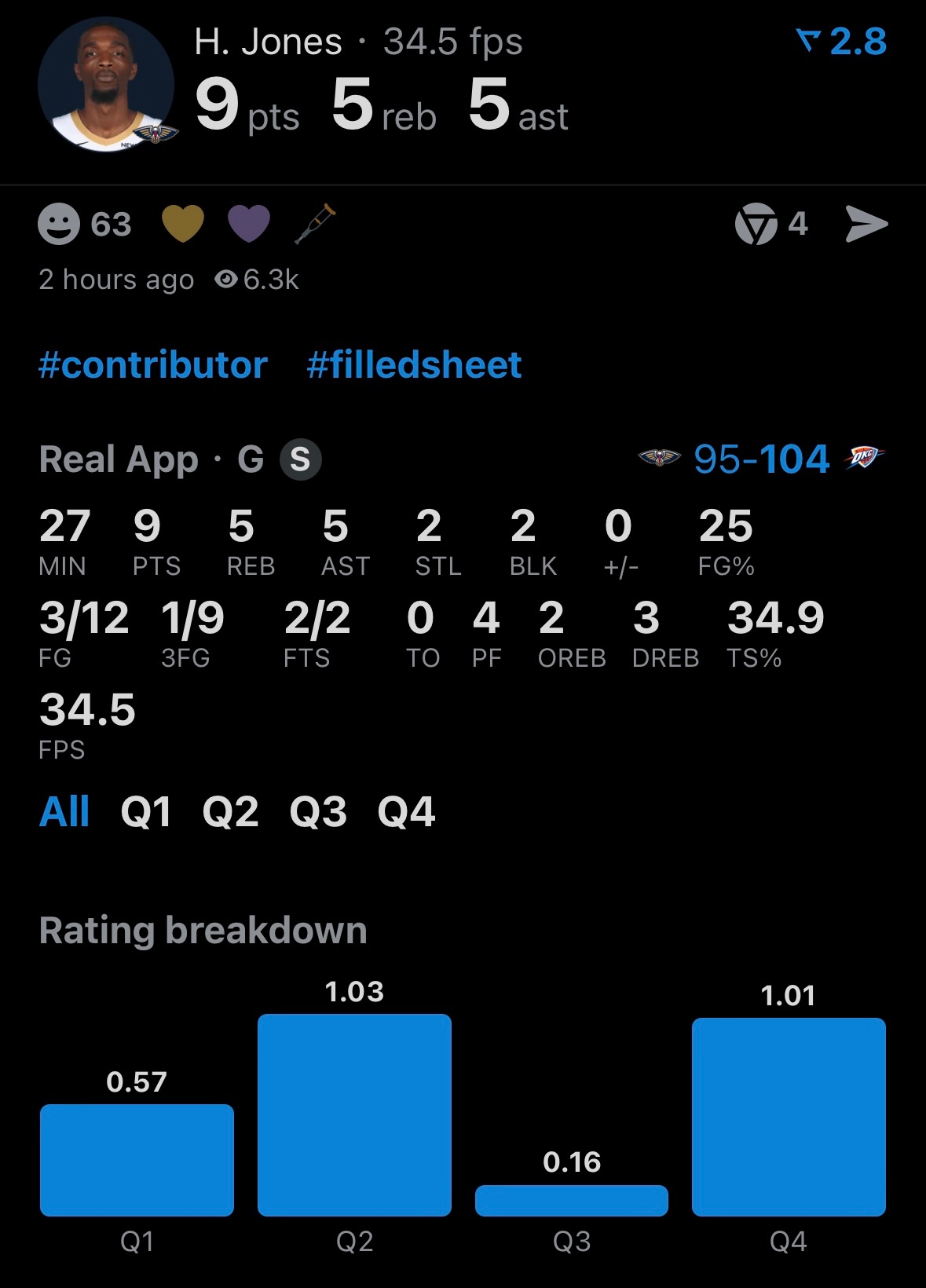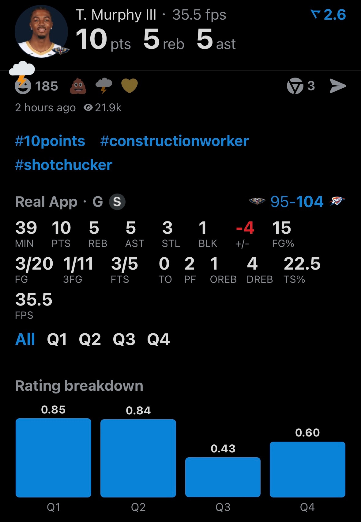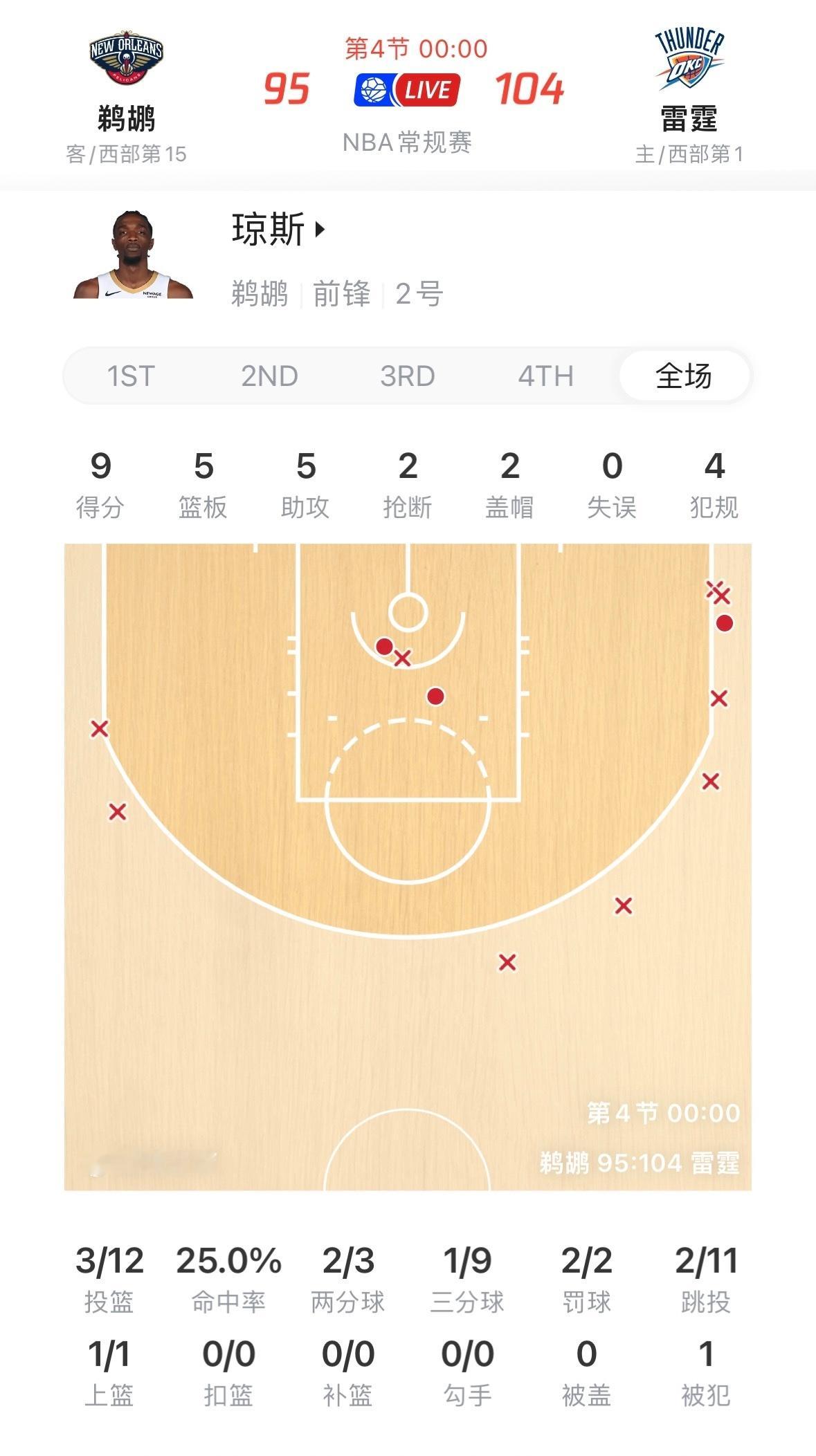 铁匠兄弟二人组,鹈鹕95-104不敌雷霆。墨菲20投3中,三分11中1,得到10分5板5助攻。 琼斯12投3中,三分9中1,得到9分5板5助攻。