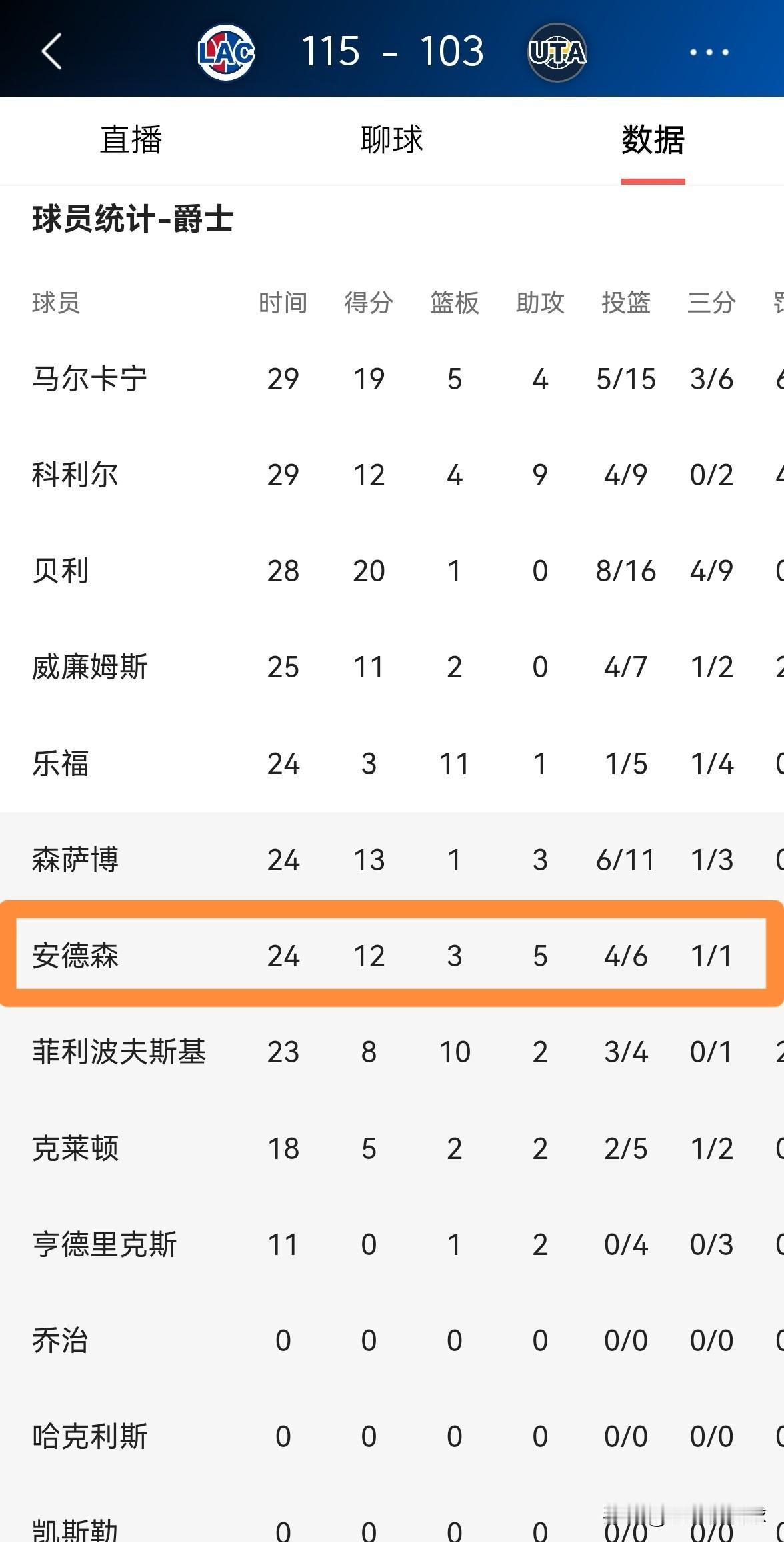 我真为爵士大将安德森鸣不平!虽然今天爵士在主场以103:115输给了快船,但是安德森在攻防两端都打出了可圈可点的表现。整场比赛下来,安德森替补出战24分钟,投篮6中4,其中三分球1中1、罚球3中3非常高效的砍下12分,还有3篮板5助攻1抢断,没有出现任何的失误,他的场上正负值为+7。 实事求是的说,我真为安德森鸣不平,因为以安德森的能力来看,他完全可以在一支强队里大展拳脚,可惜的是他只能窝在爵士这样的烂队里浪费光阴。