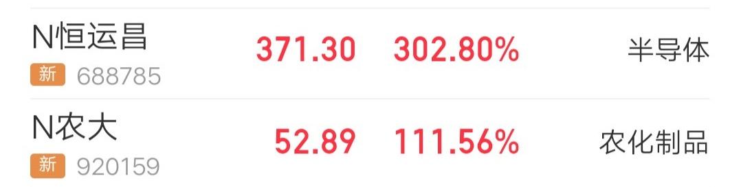 A股今天最幸福的一批人诞生了 就是打新中签的散户们 N恒运昌收盘涨幅302.8% N农大收盘涨幅111.56% 耐心拿到尾盘,然后一键清仓 超级大肉装进口袋,心情十分愉悦呀 羡慕的我直流口水呀 N恒运昌主营半导体设备,肩负国产替代的重任 N农大主营新型肥料,专注农化制品领域 上市后在参与有一定的风险 只有打新才是稳赚不赔的法宝 我也要打新了