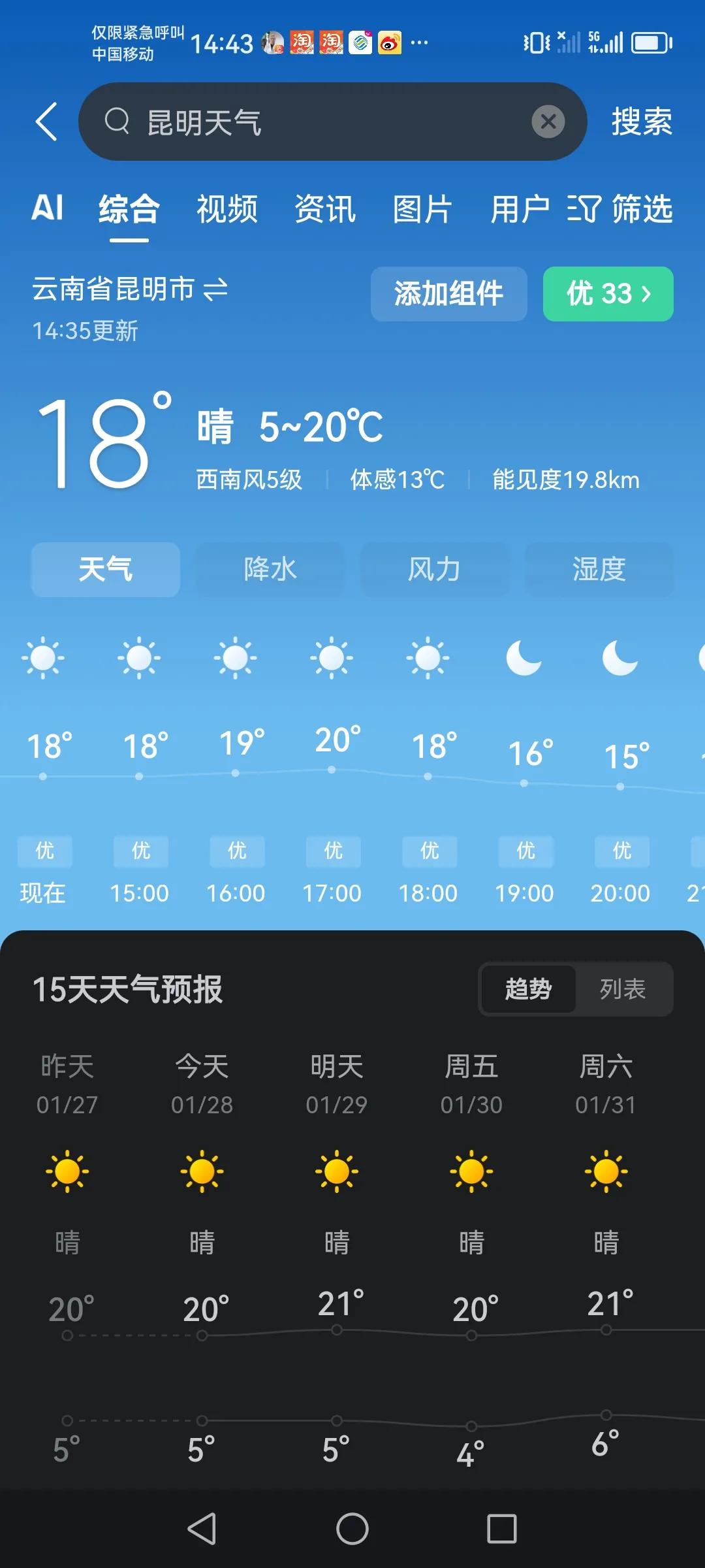 今天下午这个时候昆明的气温怕不只20度,如果不是亲自体验以为现在外面有二十三四度是真的,穿着短袖也可以,出门顺便穿件不太厚的外套刚刚好,还会出点毛毛汗,感觉是有点热!