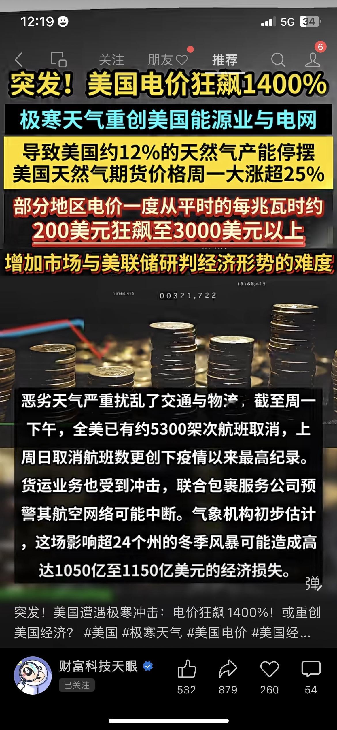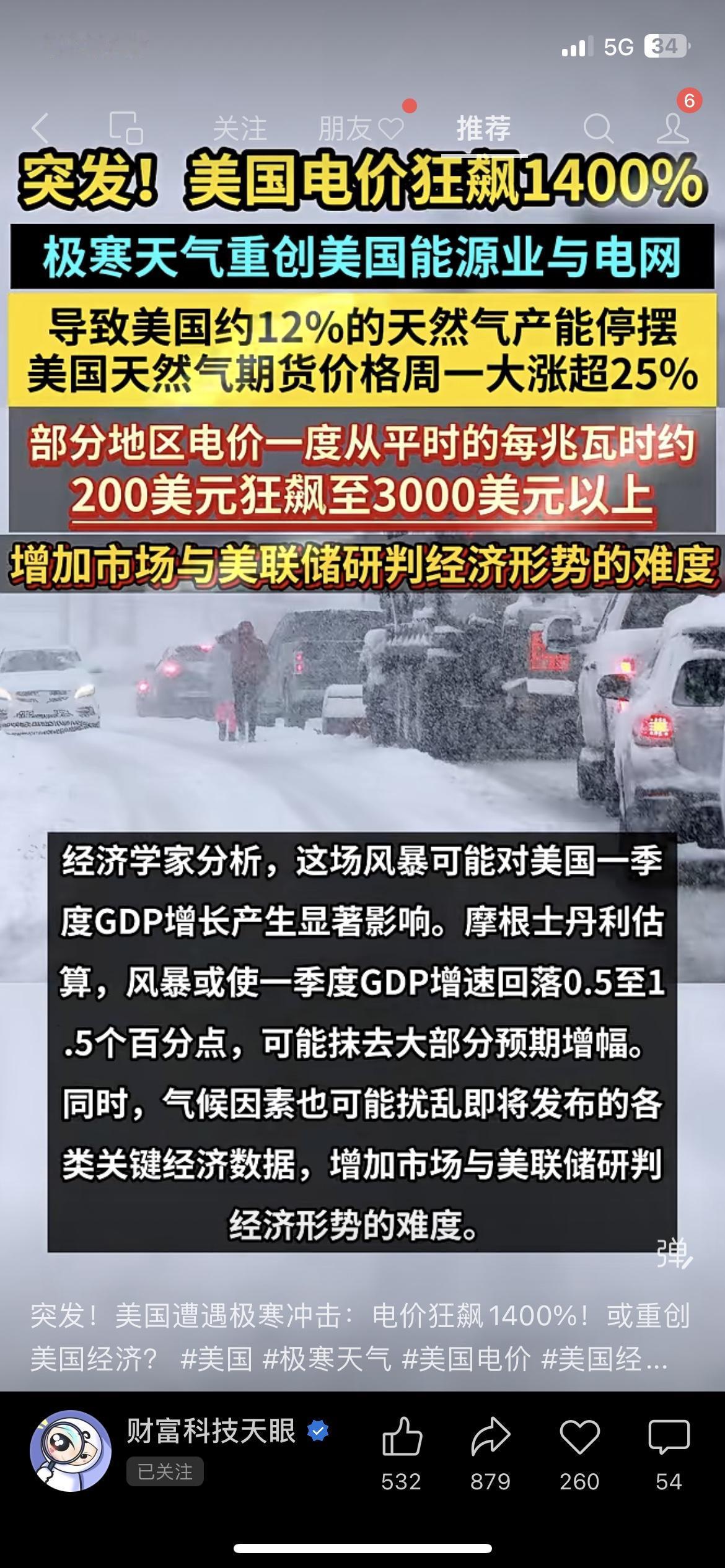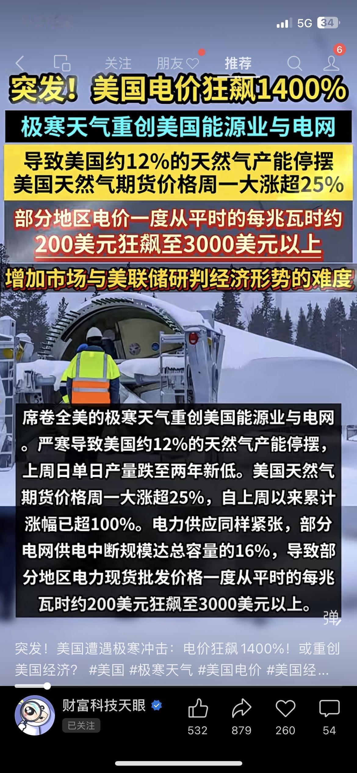 😱美国电价疯涨1400%!天然气产能停摆 极寒天气重创美国能源业,部分地区电价从200美元飙到3000美元以上,天然气期货大涨超25%,经济损失或超千亿! 我在美留学的表妹说,家里空调都不敢开了。 你觉得这会推高全球能源价格吗? 美国电价 极寒天气