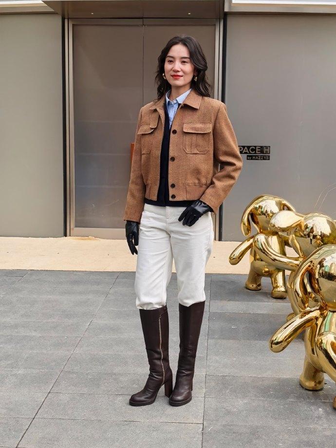 今天宋佳在出席时尚活动的时候搭配的很有精致感,看上去也格外的显年轻。 她里面穿蓝色衬衣,然后套着一款黑色的马甲,两件衣服叠穿的效果很不错。 宋佳下身穿白色裤子,不仅显得年轻,还很有高贵感,气质特别的出众。 她脚踩咖啡色的靴子,还戴着黑色的手套,确实是非常有魅力,也很有吸引力。 宋佳的身段是极为苗条的,这么搭配让她彰显出了完美的身材比例,她还留着漂亮的披肩长发,戴着奢华的耳坠,很有国际大牌明星风采。