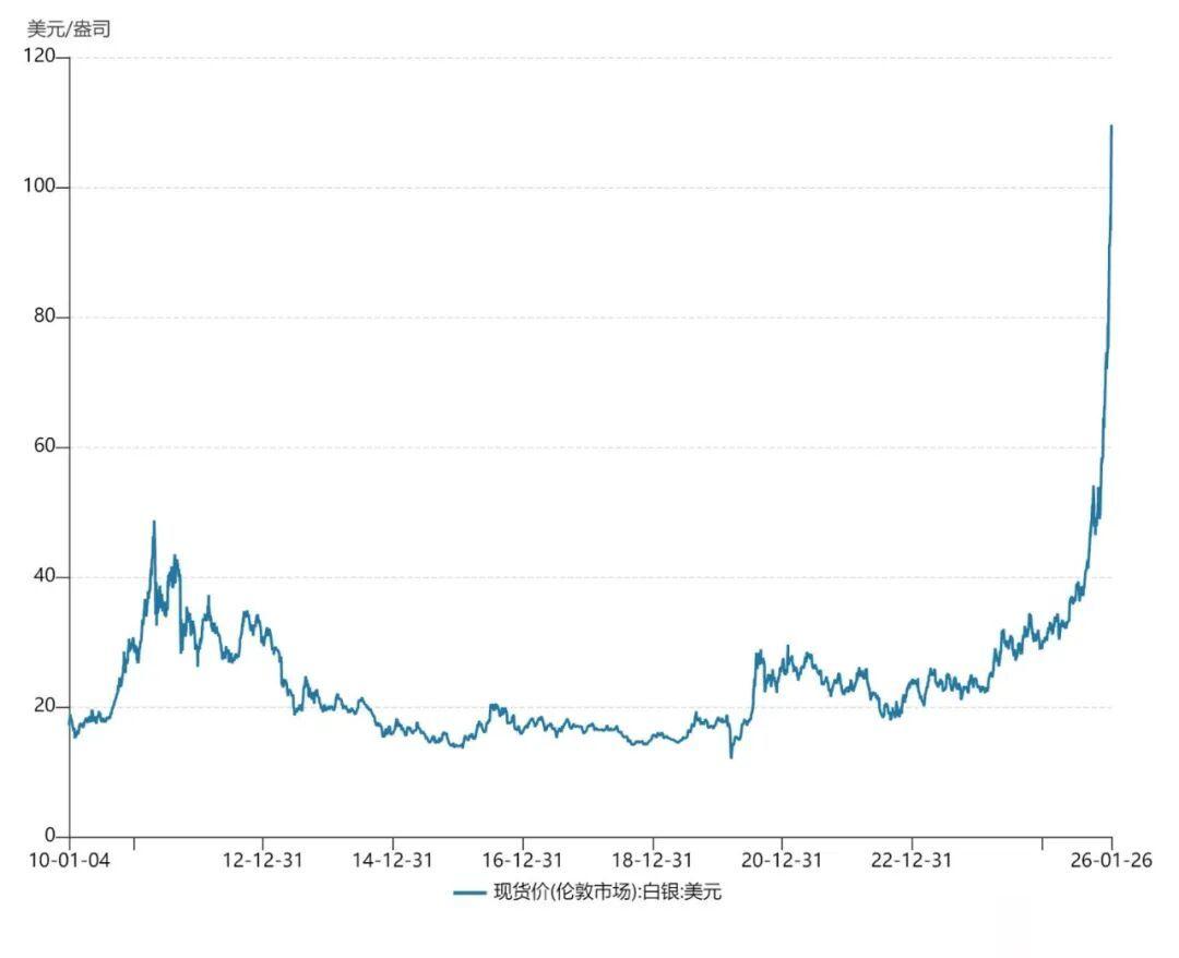 2010年至2026年1月26日现货白银价格走势截图自Wind