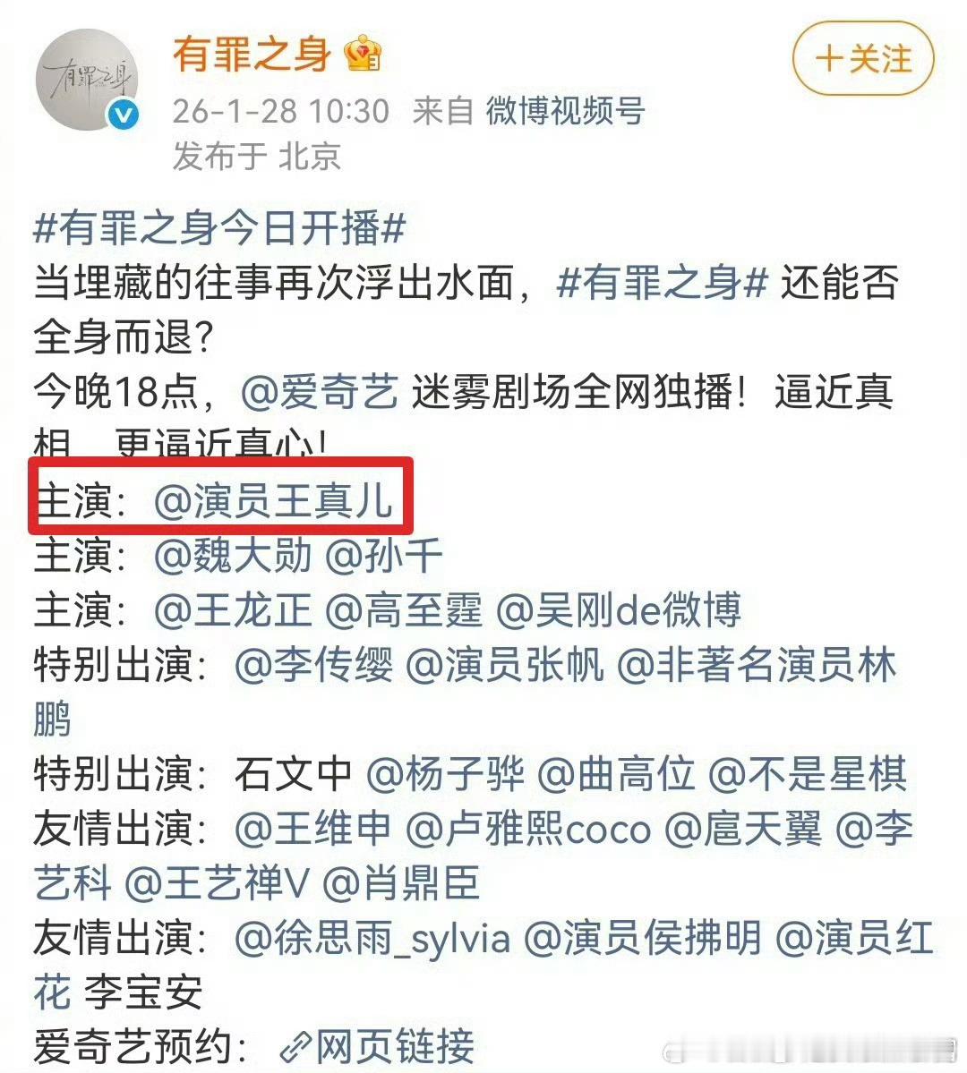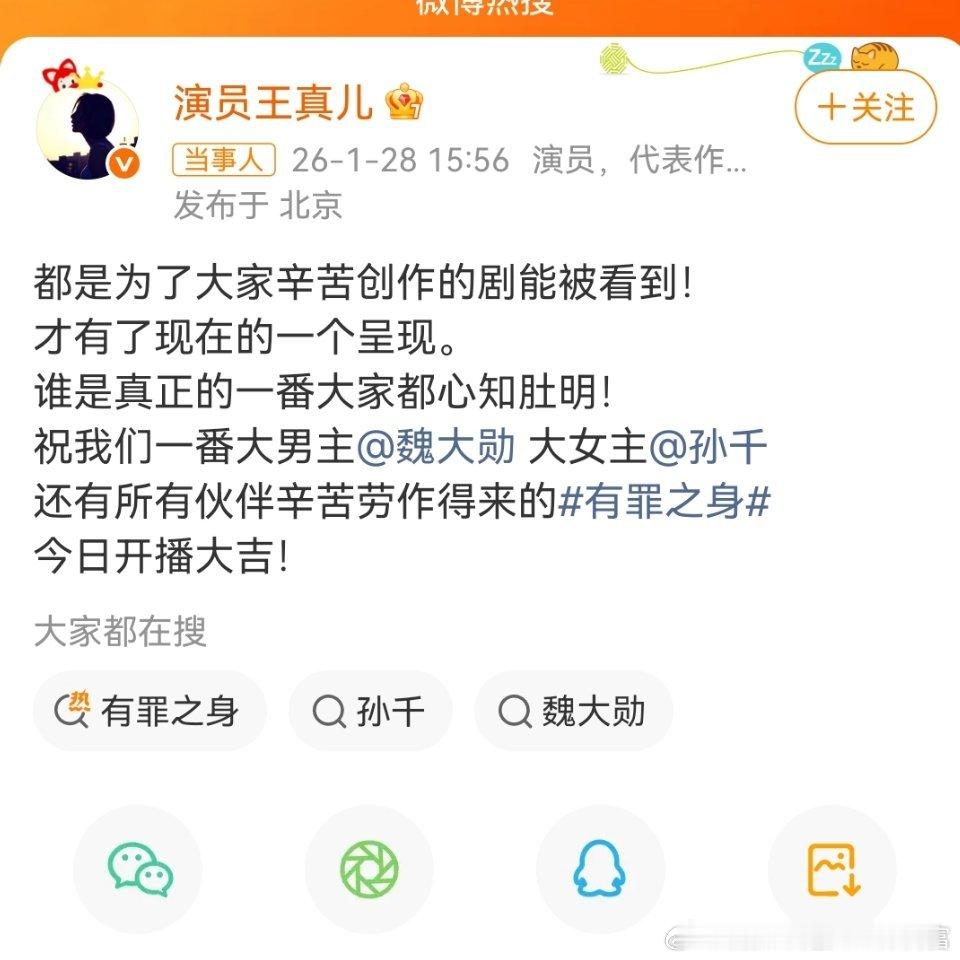 魏大勋孙千《有罪之身》今日开播,魏大勋一番变二番。开机时只是友情主演的王真儿变成了一番主演,王真儿发文回应:谁是真正的一番大家都心知肚明,还特意强调了一番大男主魏大勋大女主孙千王真儿友情主演变一番