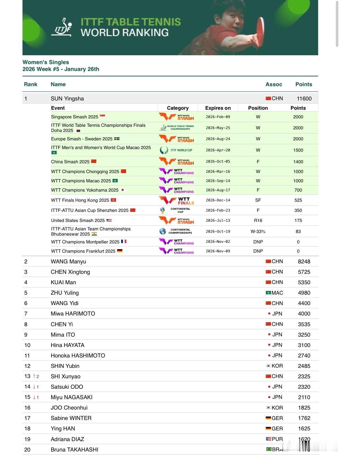 WTT冠军赛积分再次调整2026 Week 5(1.26)🏓世界排名本周积分主要变动增加:WTT常规挑战赛马斯喀特站 下周亚洲杯加油