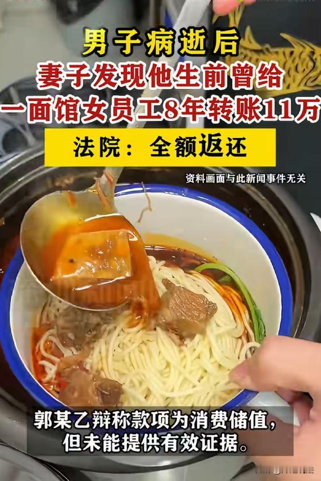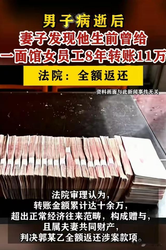 内蒙古包头,男子突然离世,妻子整理他的遗物时,发现丈夫从8年前开始给一个陌生女子转账,一共转了117362元。妻子和这名女子对质,对方却说:我是面馆店员,他转给我的钱是在店里吃面的消费!可妻子不相信,哪怕丈夫每天都去,一天也要在这家店吃四十多元,这怎么可能? 据红星新闻、深圳新闻网等报道,郭女士和王某是夫妻关系,两人结婚多年,生活虽然平淡,但总体来说也算幸福。 2025年4月,灾难突然到来,王某突发疾病离世,郭女士还来不及反应,就和他天人永隔了。 郭女士一下子失去顶梁柱,心里的悲痛可想而知,办理完王某的后事,郭女士开始收拾心情整理王某的遗物。 在查看王某的消费记录时,郭女士突然发现不对劲,从2017年开始,王某开始陆陆续续给一个女人转账,每次转账的金额都不多,但累计起来竟然有11万多元。 这个人是谁?丈夫为什么给她转钱?难道她看似幸福的家庭,早就有了第三者插足? 郭女士只是一个家庭妇女,心里有了疑惑就想搞个清楚,而且她家里本就过得不宽裕,现在又失去了丈夫,这11万多元对她来说,可算是一笔巨款。 于是,郭女士尝试联系对方,两方一对质,这才知道对方那个女子也姓郭,是一家面馆的店员。 郭女士询问郭某,为什么自己的丈夫经常给她转账。 郭某解释说,王某是她店里多年的老顾客,经常在店里吃饭,这些钱有的是吃饭付的饭钱,有的是王某委托她进行储值和买礼盒等的花费,但她收到这些钱后,都按照王某的要求用于他的个人消费了。 听完郭某的解释,郭女士有点动摇了,因为王某每次转给郭某的钱都不多,基本每次都是几百块钱,而且没有备注,也从来没有520、1314或者999这种特殊金额。 郭女士以为自己误会了丈夫,可是她仔细一算就发现不对,不到8年时间,将近3000个日夜,哪怕丈夫每天都去店里吃面,一天也要花四十多块钱。 这家卖的面又不是金子做的?怎么可能这么贵?况且,他又怎么可能每天都去吃面呢? 郭女士越想越不对,可郭某就咬准一句话,王某转给她的钱,都用于了他在店里的消费,不是对自己的赠予。 郭女士认定郭某和自己丈夫肯定有见不得人的关系,于是起诉郭某,要求她返还这117362元。 那么,王某转给郭某的钱到底是怎么回事?郭某需不需要返还呢? 1、经审理认为,王某和郭某不属于正常的顾客与店员关系,王某转给郭某的钱,也不属于赠予。 经查明,从2017年8月28日开始到2025年3月15日,王某一共转给郭某117362元。 郭某辩解称,这些钱全部用来在店里消费储值或者买礼盒用了,但是口说无凭,郭某并没有拿出一个相应的储值记录,或者在店里买礼盒的消费记录来证明。 而且,王某给郭某转账时间跨度为8年,金额达到了11万余元,虽然转账金额没有特殊意义,也没有备注,但这种来往,显然已经超出了正常的顾客和店员之间经济来往的合理范畴。 因此,对于郭某的辩解不予采信。 2、王某转给郭某的11万余元属于夫妻共同财产,王某构成无权处分。 经审理认为,依据《民法典》关于夫妻共同财产的规定,案涉款项发生在王某与原告郭女士婚姻关系存续期间,属于夫妻共同财产。 夫妻对共同财产有平等的处理权,但夫或妻非因日常生活需要对夫妻共同财产做重要处理决定时,夫妻双方应当平等协商,取得一致意见。 王某未经郭女士同意,擅自将大额夫妻共同财产转给郭某,该处分行为并非基于夫妻日常生活需要,且郭女士对此不予追认,所以王某的行为构成无权处分。 而根据《民法典》规定,无处分权人处分他人财产的行为无效。 王某与郭某之间的赠与行为因王某的无权处分而无效,同时,郭某主张自己是善意取得,却未提供其属于善意取得的证据。 善意取得需要满足一定条件,如受让人受让该财产时是善意的、以合理的价格转让等,本案中郭某无法证明这些条件成立。所以,郭某应当返还这117362元给郭女士。 最终,法院认定王某转给郭某的钱属于无效赠与,郭某应全额返还。