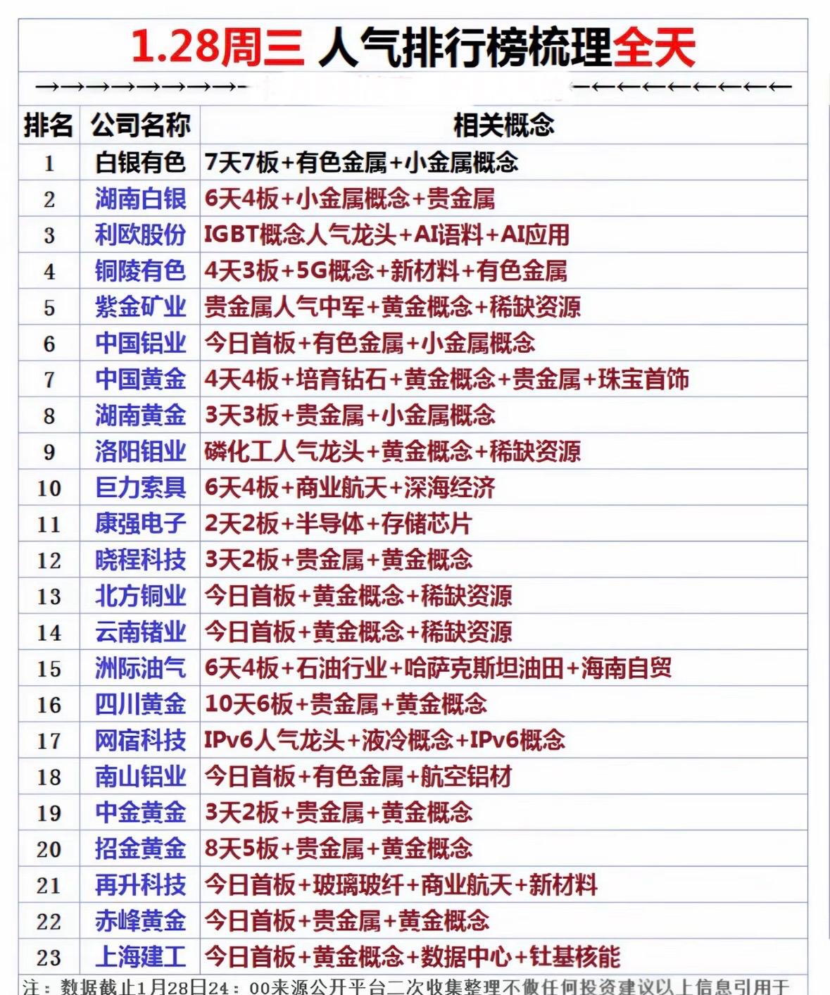 1.28周三人气排行榜梳理全攻略 📈📈📈 贵金属与有色金属板块领涨,多只个股连板,涉及黄金、小金属及新材料概念,市场热度高涨。