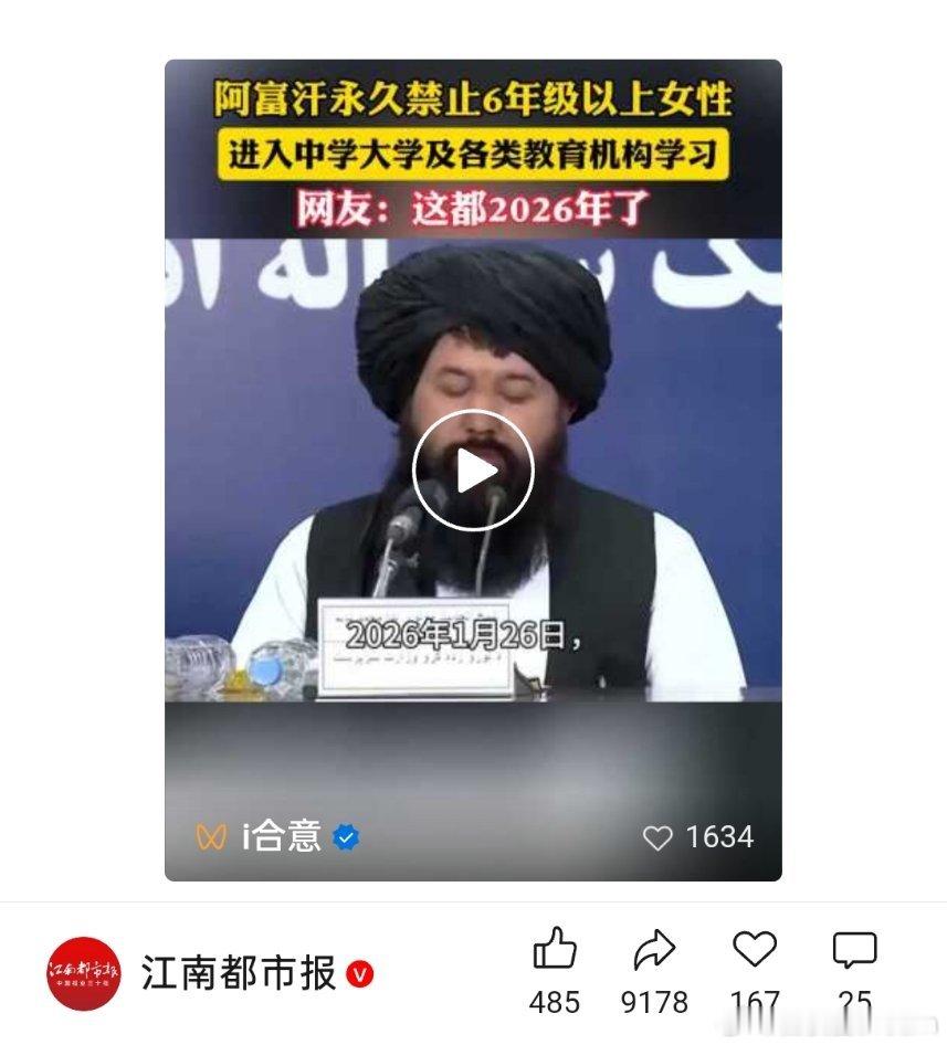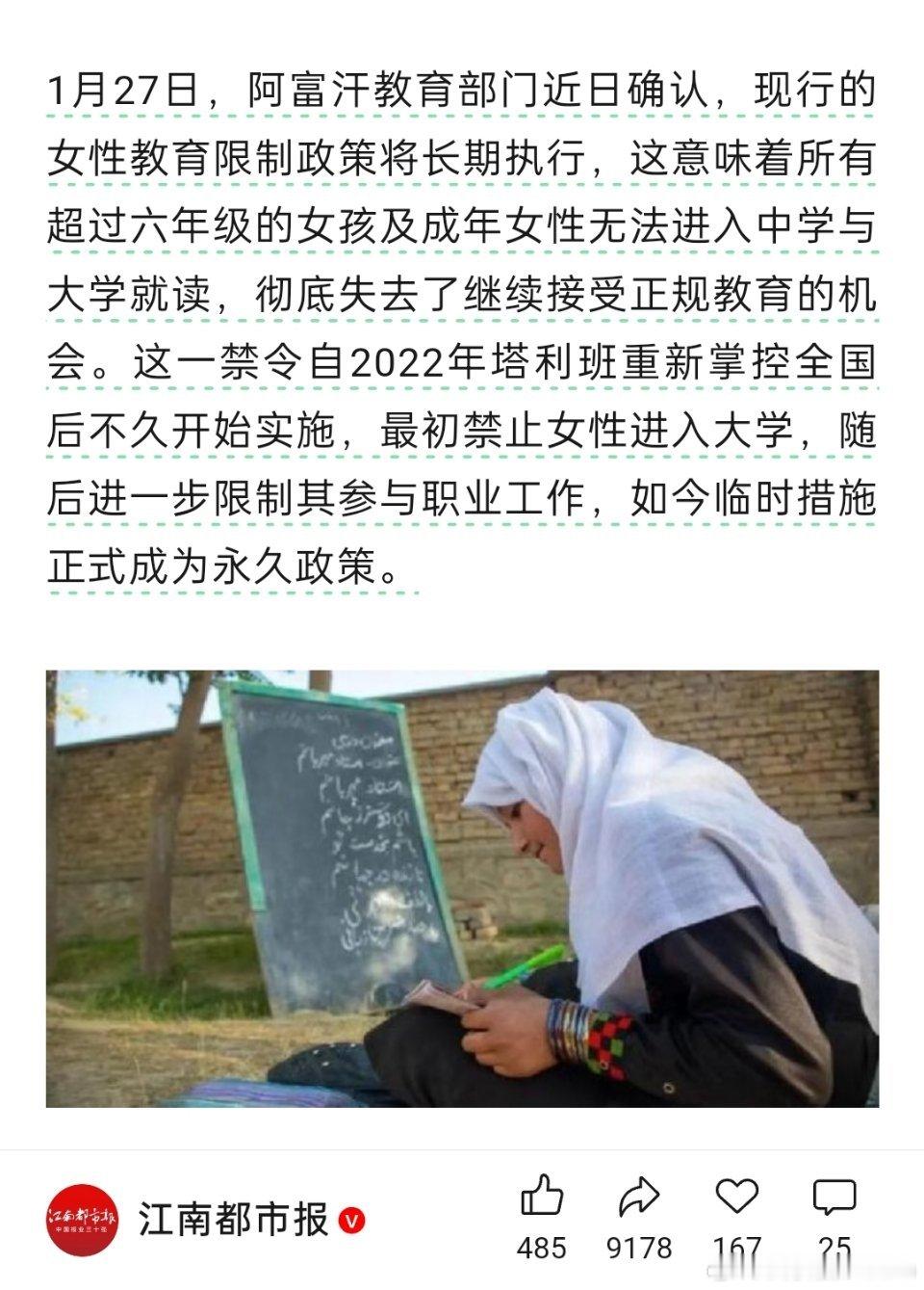 阿富汗永久禁止女性上学🔻阿富汗宣布禁止女性读中学和大学,女性可以在小学上学读书。