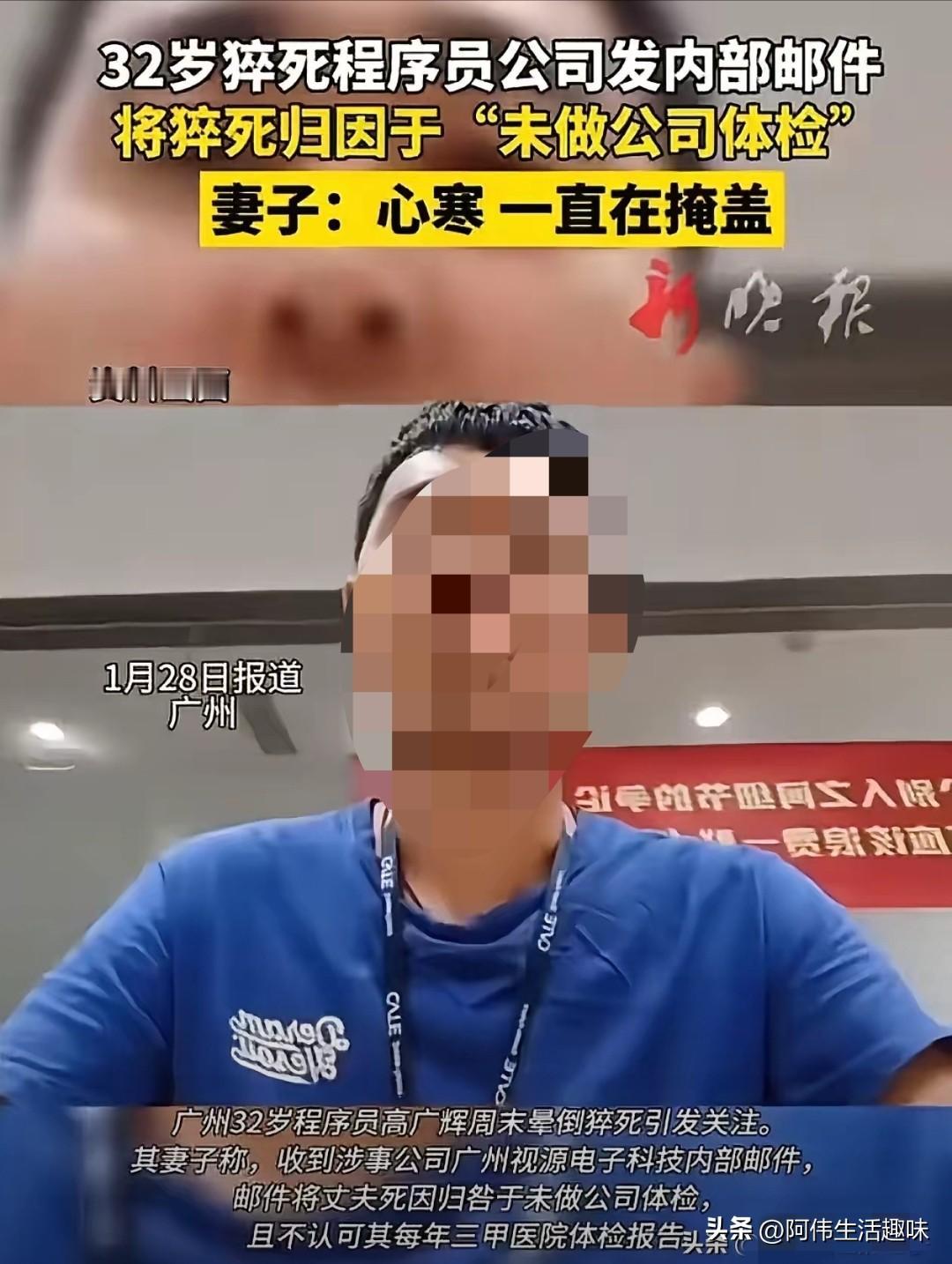 把32岁程序员猝死当成案例发布内部邮件 提醒全体员工要定时做体检 我只能说 视源这波甩锅的操作搞得真漂亮 杨女士提交的工伤鉴定刚被受理 视源立即发邮件提醒全体员工 让广大员工不能忽视体检的重要性 并强调原公司程序员高广辉就是因未安排体检才出的意外 还说公司之前的26号和27号都提醒过高广辉体检 但记录中高并没有来参加体检 可据杨女士说他丈夫患有乙肝 每年都会自费在三甲医院做体检 按照视源发的员工邮件案例说 是因为高广辉没在公司指定健康管理做体检 导致出了意外 而杨女士说法 丈夫每年都有在三甲医院体检 视源这边并不认可 大写的服 视源那边定找了高人指点 不然如何能想到借助提醒全员体检之事 拿高广辉当成案例 这种甩锅的手法可谓一般 给大众的感觉: “高的猝死是因没有重视体检导致的意外 我们也尽责提醒过 可他没听 这不是我们的责任咯” 高,真是高啊