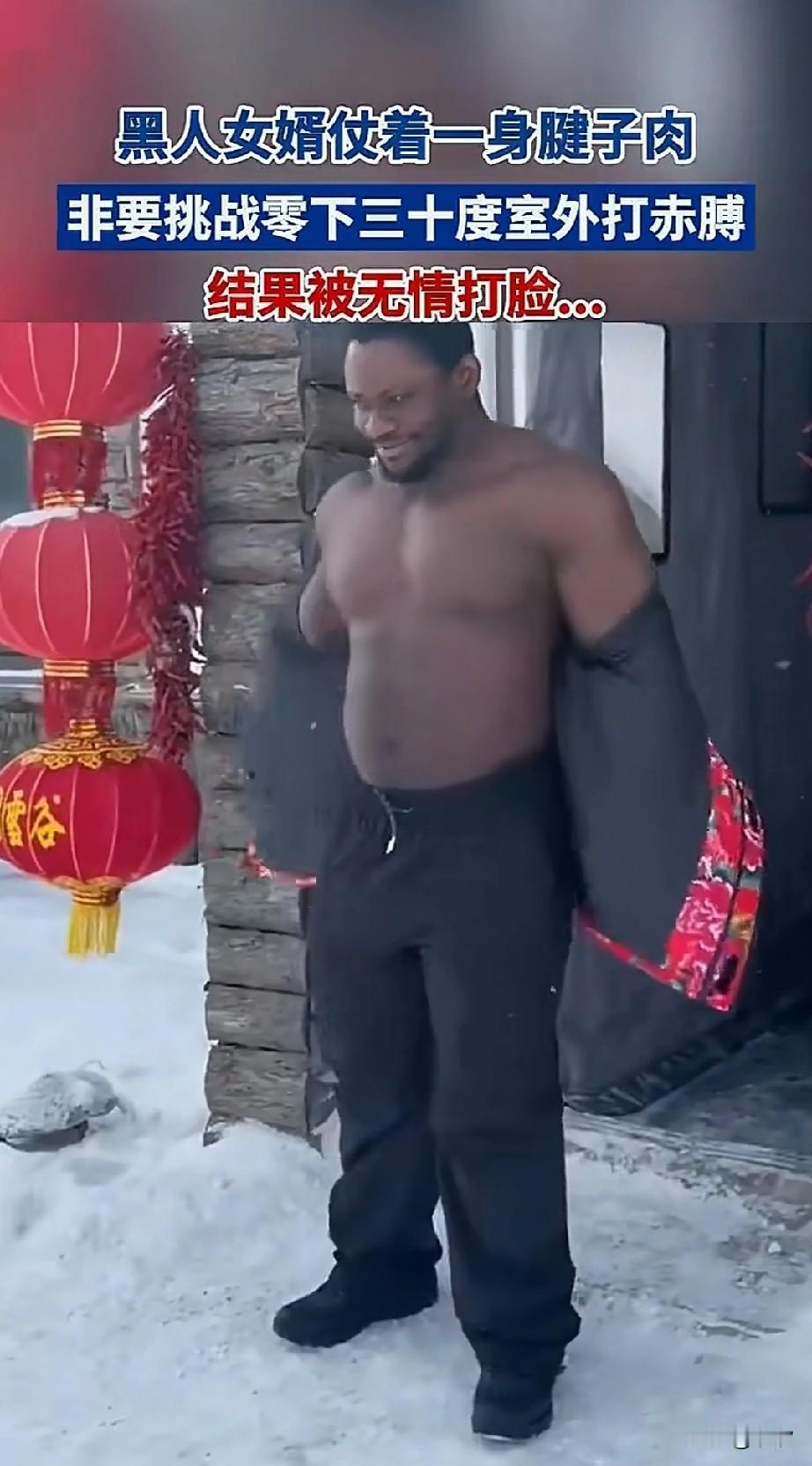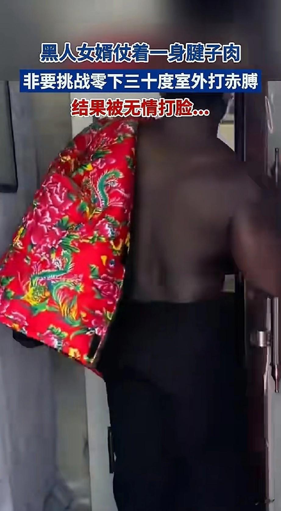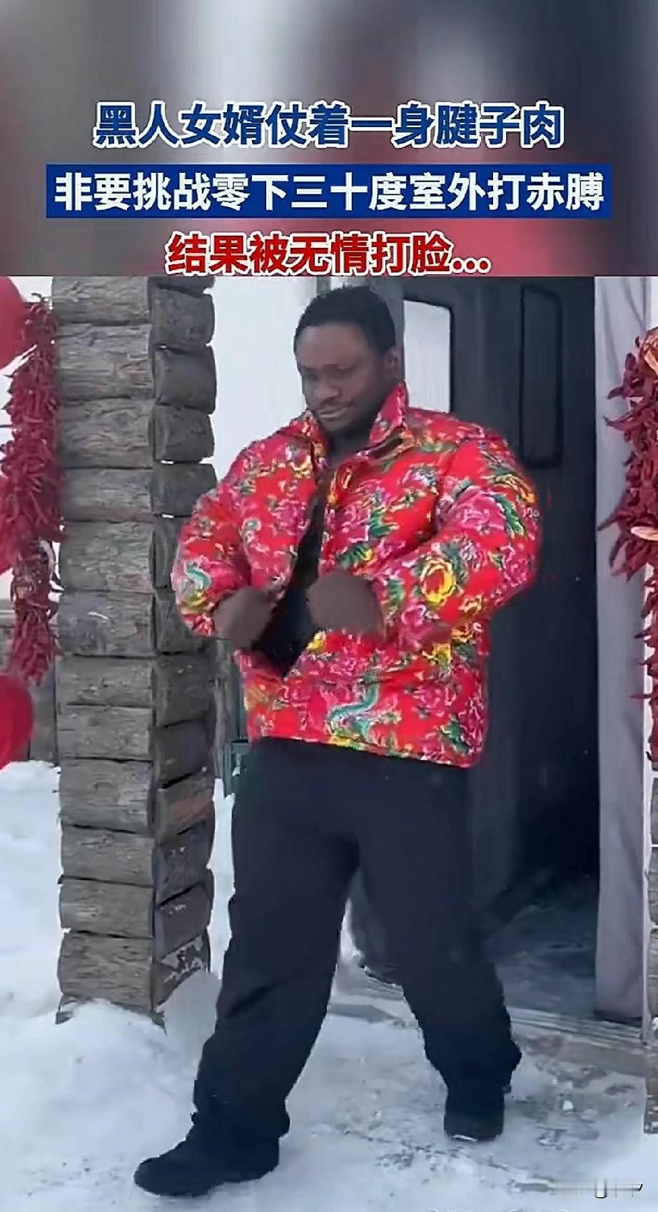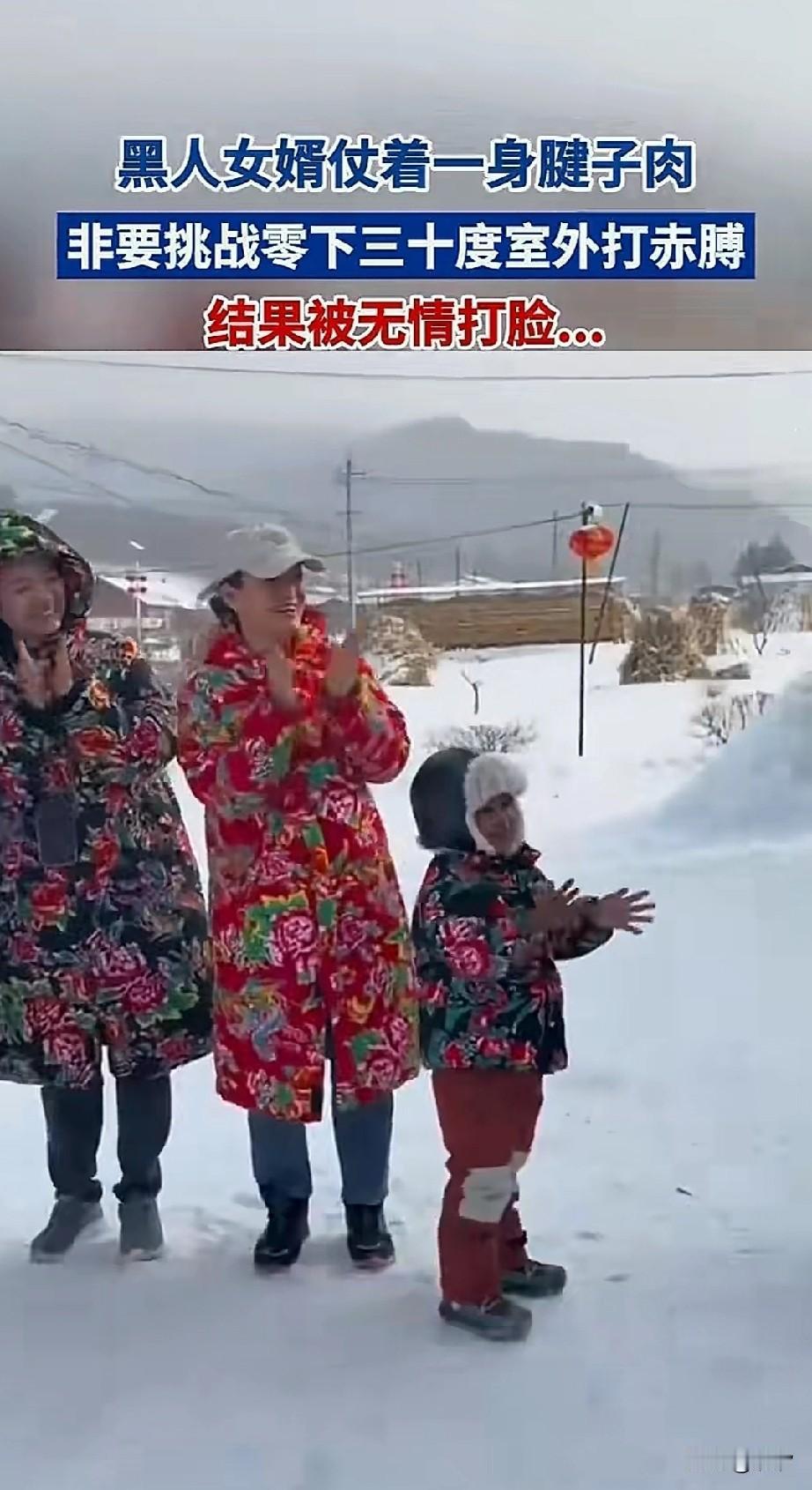 东北黑人女婿仗着自己是一身腱子肉,非要在雪天表演武术,全家人出门给他鼓掌! 只见他脱掉红棉袄,露出了全身的肌肉,刚开始确实很英勇,但是帅不过3秒! 刚离开暖和的屋子没多久,直接冻的呲牙咧,随后赶紧穿上了外套,匆匆忙忙的跑回了暖和的屋内! 他的家人还在开心,给他鼓掌加油!他的老婆自豪的给他拍下了这一幕,因为他觉得这很有趣, 平时他们就在网上分享自己的生活,这次是找到了创作灵感,毕竟这样的反差可以赚到不少流量, 不愧是他的好女婿,出去没到几分钟就跑回去了,嘴上很硬,身体确实很诚实,这就是强壮的黑人吗? 大家对于东北媳妇儿拍摄黑人老公雪地打拳这事怎么看? 东北 黑人媳妇儿 外国洋女婿