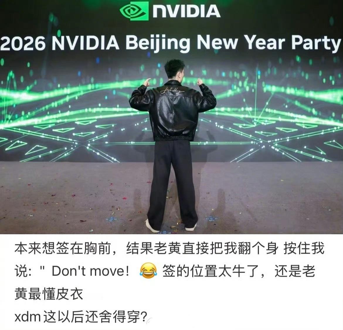 英伟达员工晒年会最牛年终奖英伟达员工晒出年会神仙年终奖,竟是黄仁勋亲笔签名的经典皮衣!据该员工分享,原本想让老黄把名字签在皮衣胸前,结果被老黄直接翻身后按住喊出“Don't move”,最终签名落在了后背,独特的签名过程让这份礼物格外珍贵,员工直呼舍不得穿,老黄的随性与幽默也让网友直呼太有亲和力。英伟达英伟达