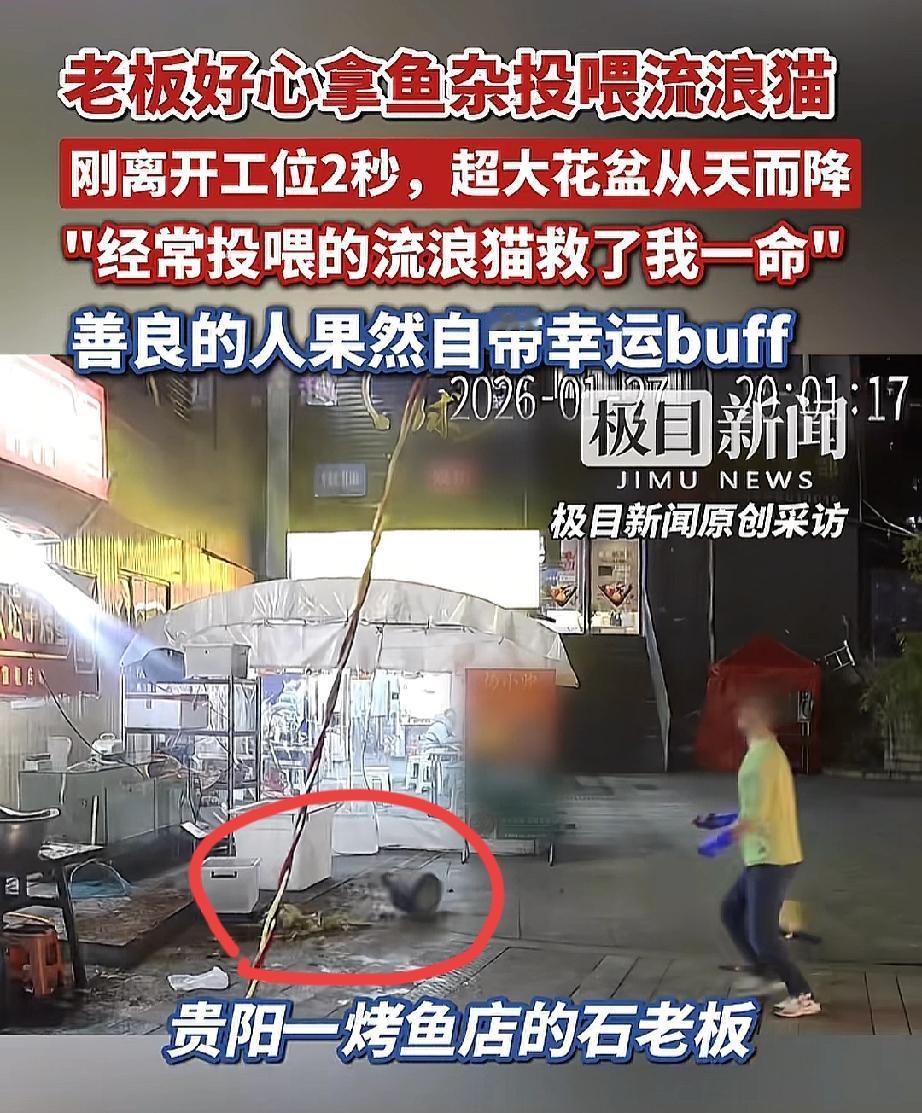 好心喂流浪猫, 竟意外避祸。 27号晚,贵阳一烤鱼店老板正在店门口杀鱼,看见有流浪猫过来,就拿鱼杂去喂。 谁知刚离开工位2s,一个10多斤重的花盆”哐当”砸在了他刚才杀鱼的地方。 这不是高空抛物,而是员工修二楼探照灯时意外碰落的。 这么重的花盆,要是真砸人头上了,后果可想而知。 店老板因随手的善意,与劫难插肩而过,这让我想起一句老话:“你只管善良,上天自有衡量”。 我们常说“好人有好报”,这个好报有时并不是指能直接兑换的奖赏,也有可能在某个关键点,以另外的方式回报你。 但问好事,莫问前程。你们相信,你发出的善意,最终会回到你的身边吗?来评论区聊聊你的看法~