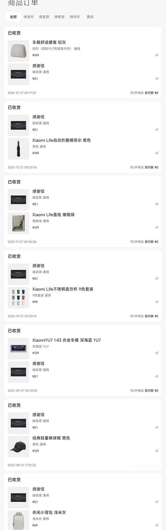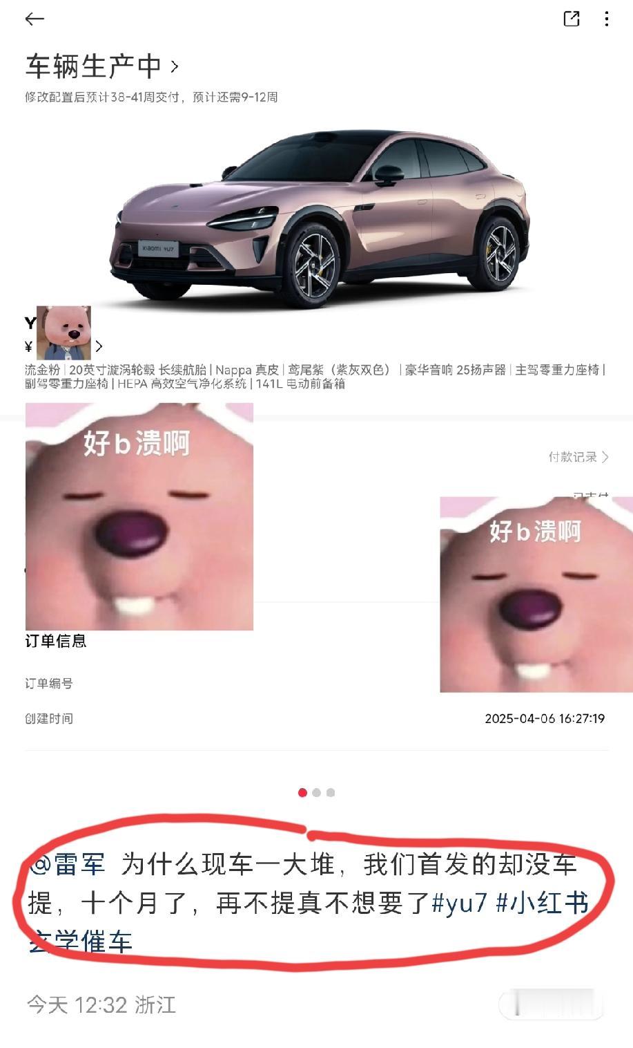 浙江这位小米yu7车主,一开始是下定了一台小米su7,还剩20周的时候改配成了yu7,变成了40周提车,后来又改配变成了62周。 现在他发文吐槽:为什么现车一大堆,我们首发的却没车提,足足十个月了,再不提真的不想要了。 这期间,这位车主单单小米汽车的关怀礼就收到了七份:茶杯、雨伞、帽子、车模、靠垫、背包等。 有没有可能,这位车主就不想要这台车了,就想靠这一直改配下去一直收关怀礼把5000元定金给赚回来?[捂脸][捂脸][捂脸] 不知道这样的车主有多少?