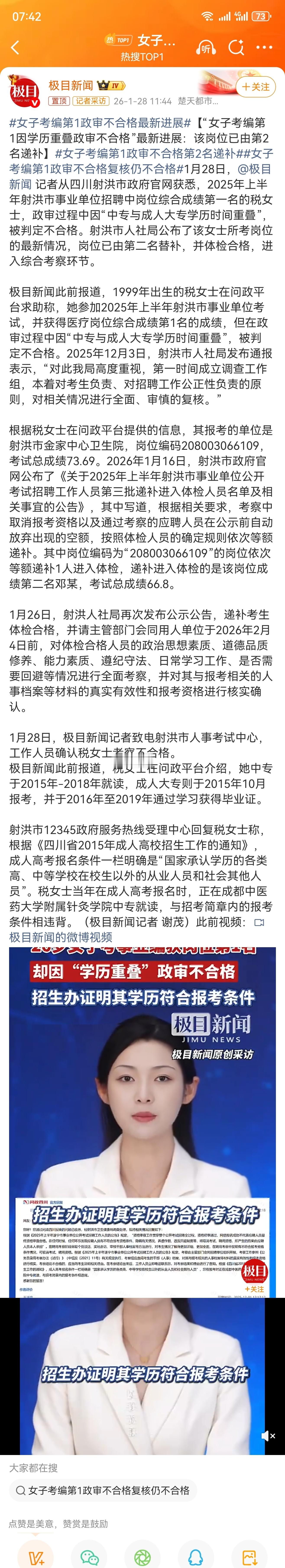 散了吧,唉,说什么也没用,虽然总觉得太教条和僵化了。原来是成人高考报名是有条件的,在校生不能报考,她是隐瞒自己中专在读的状态了女子考编第1政审不合格第2名递补