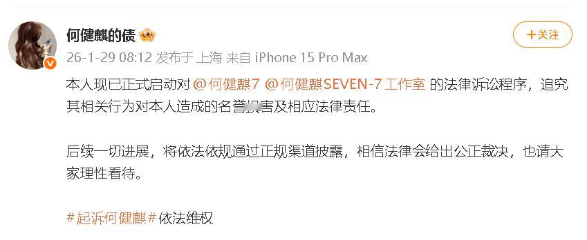 前女友起诉何健麒及其工作室前女友称已起诉何健麒及其工作室 何健麒前女友发文称已启动对何健麒及其工作室的法律诉讼程序,“将追究其相关行为对本人造成的名誉损害及相应法律责任。”