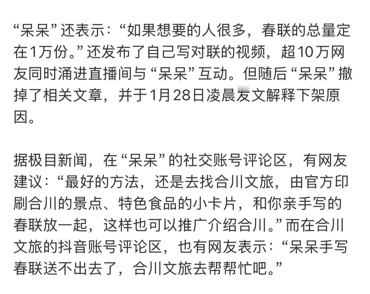 网红呆呆春联送不出网友喊话合川文旅看了下,这个手写春联确实送不出去,大概率没人会挂到自己门前。字送不出去,网友又喊话文旅帮忙,真的有点无聊了。流量时代,谁都有五分钟成名的机会,但真的把自己当名人就有点尴尬了。找文旅合作,像是一场闹剧。之前的个人创意可以一夜爆火,而官方机构不太合适接住这种突如其来的热度炮弹。合川文旅即便下场,大概率也只会变成一场公关式的符号合作,味道就全变了。分析:【又闯祸啦?继摇人按猪后网红呆呆又计划送春联】网红呆呆春联送不出网友喊话合川文旅继“摇人按猪
