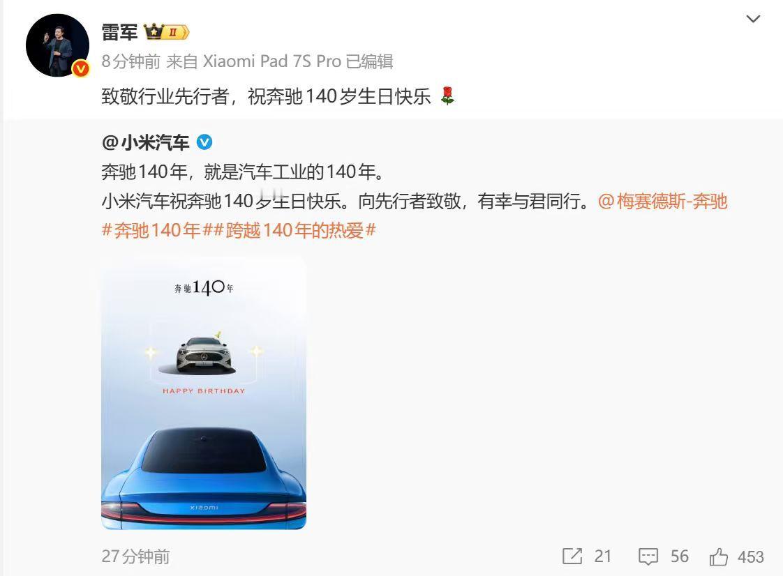 【雷军祝贺奔驰生日快乐】1月29日,发文祝贺奔驰:“致敬行业先行者,祝奔驰140岁生日快乐。 ”