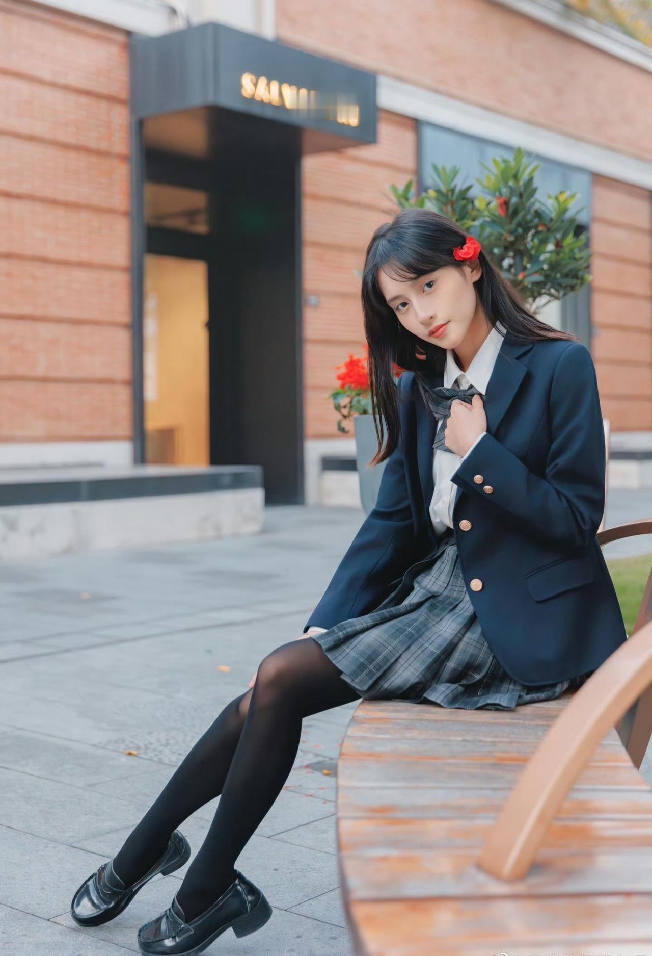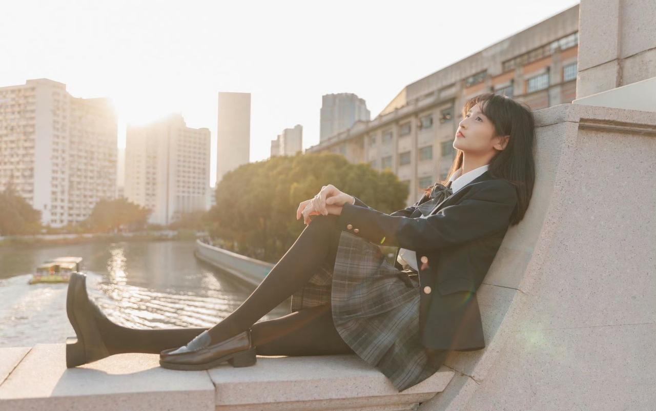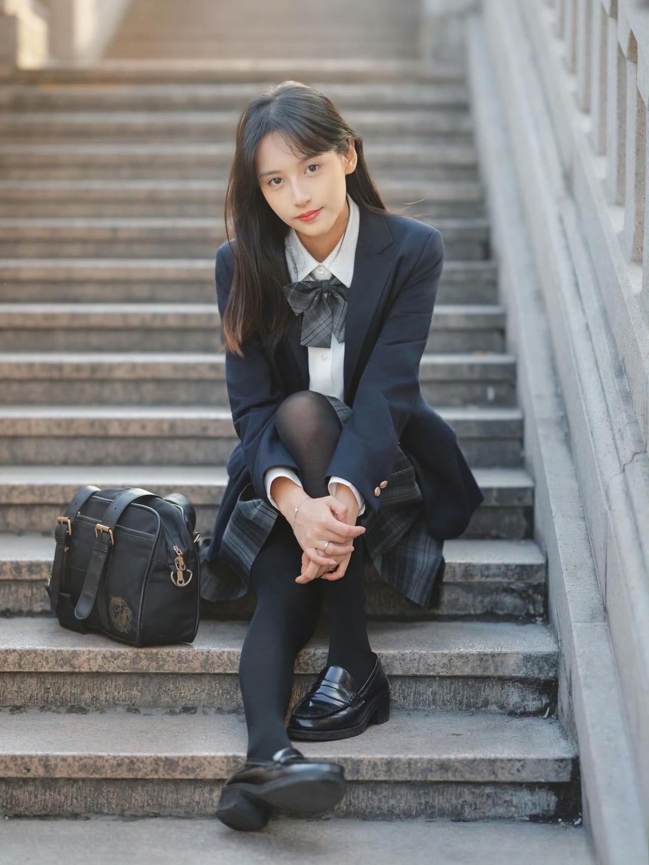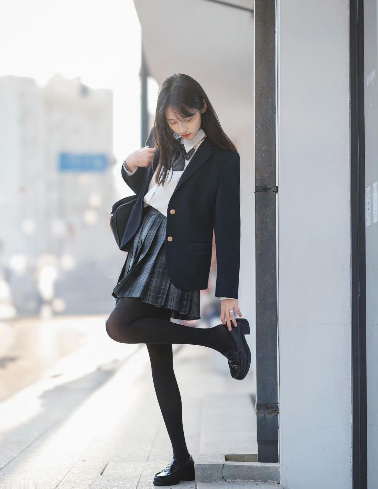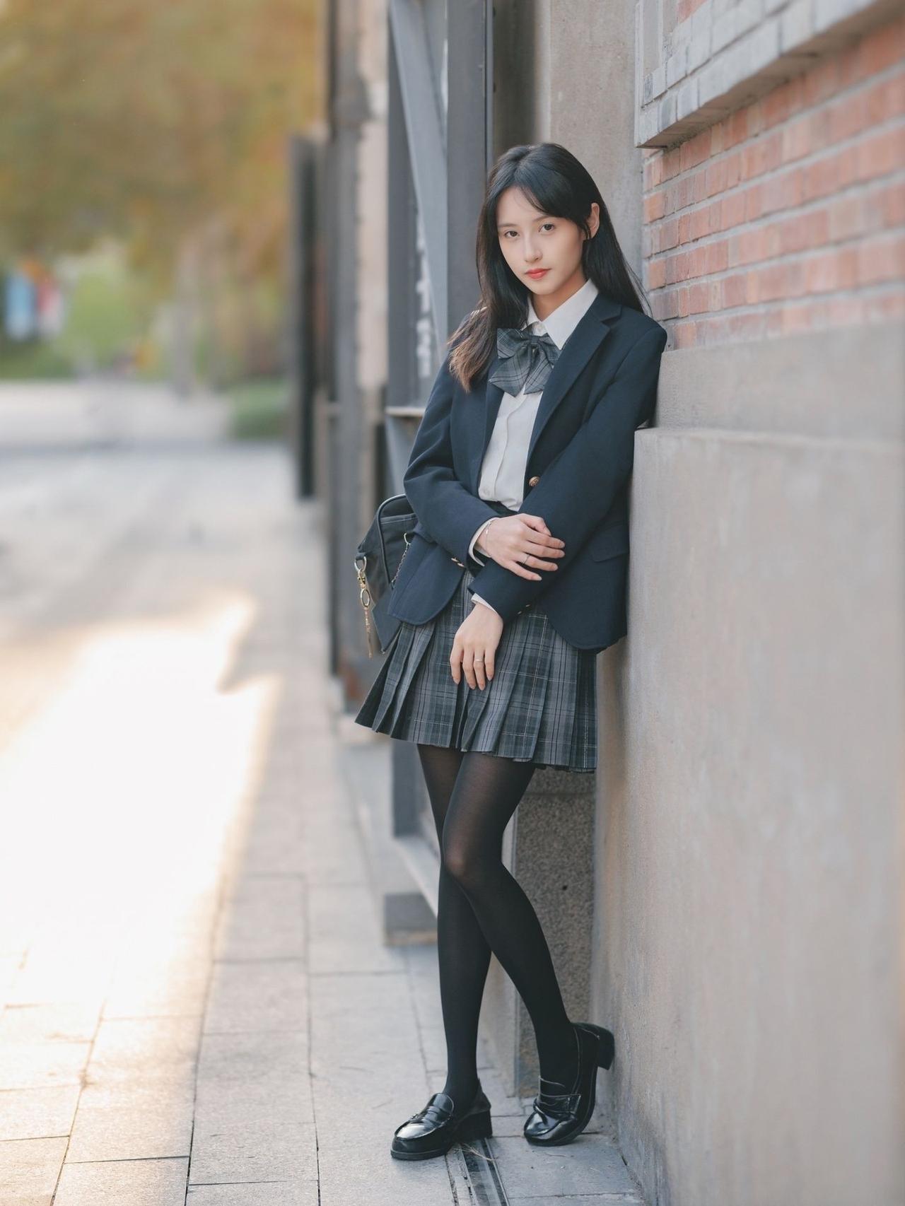 这套穿搭是清新利落的学院风,把校园感体现的淋漓尽致。JK套装藏蓝西装+格纹百褶裙自带学院氛围,白衬衫+领结添清新感。 搭配黑皮鞋强化学院利落感,和红砖建筑的复古氛围高度契合。充分展现穿着者清新靓丽的魅力。jk青春感穿搭 jk风日常穿搭 jk西服穿搭