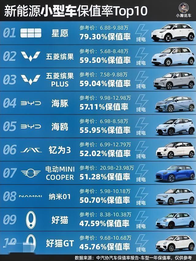 这就是赤裸裸的现实,现在买车: 50%的人﹣﹣买混动车 30%的人﹣﹣买纯油车 20%的人﹣﹣买纯电车 开一年还能卖79.3%!新能源小车保值率Top10,买错亏大了 想买新能源小车代步,除了看续航和价格,保值率才是决定你换车时亏不亏的关键!最新中汽研保值率报告出炉,新能源小型车一年保值率Top10新鲜出炉,结果让人意想不到,直接帮你避坑 黑马夺冠:吉利星愿 - 一年保值率:79.3% - 参考价:6.88-9.88万 - 不到10万的小车,开一年还能卖出近8成原价,堪称新能源小车里的保值王!凭借宁德时代电池、扎实的品控和高性价比,成为家用代步首选,换车时亏得最少。 五菱双子星霸榜 - 五菱缤果:59.50%(参考价5.68-8.48万) - 五菱缤果PLUS:59.04%(参考价7.58-9.88万) - 国民神车果然名不虚传,缤果系列以亲民价格和实用设计稳坐第二第三,销量大+配件便宜,二手流通性超强,预算有限的闭眼入。 热门选手表现 - 比亚迪海豚:57.11%(参考价9.98-12.98万) - 比亚迪海鸥:55.95%(参考价6.98-8.58万) - 比亚迪双子星凭借品牌口碑和稳定销量,保值率稳居第一梯队,海豚的大空间和海鸥的高续航,让它们在二手市场依然抢手。 避坑提醒 - 榜单尾部的欧拉好猫系列(47.59%-47.6%),虽然颜值在线,但保值率明显掉队,换车时要做好折价准备。 - 电动MINI COOPER(51.28%)虽然品牌溢价高,但小众定位+高售价,导致二手流通性一般,更适合情怀玩家。 新能源小车不再是“买了就亏”的代名词,这份保值率榜单告诉你,选对车型不仅日常代步香,换车时也能少流血。如果你正在纠结买哪台,直接按保值率从高到低选,准没错!
