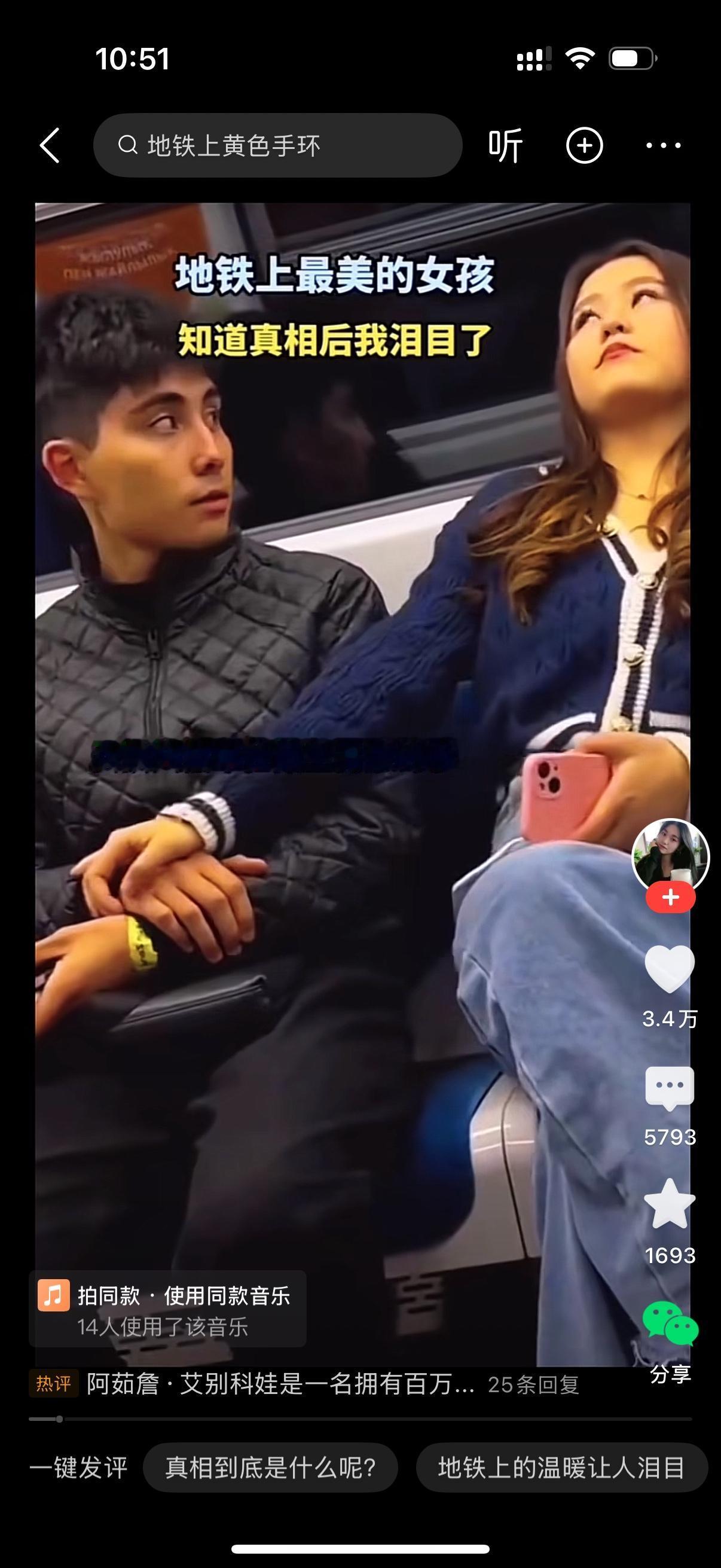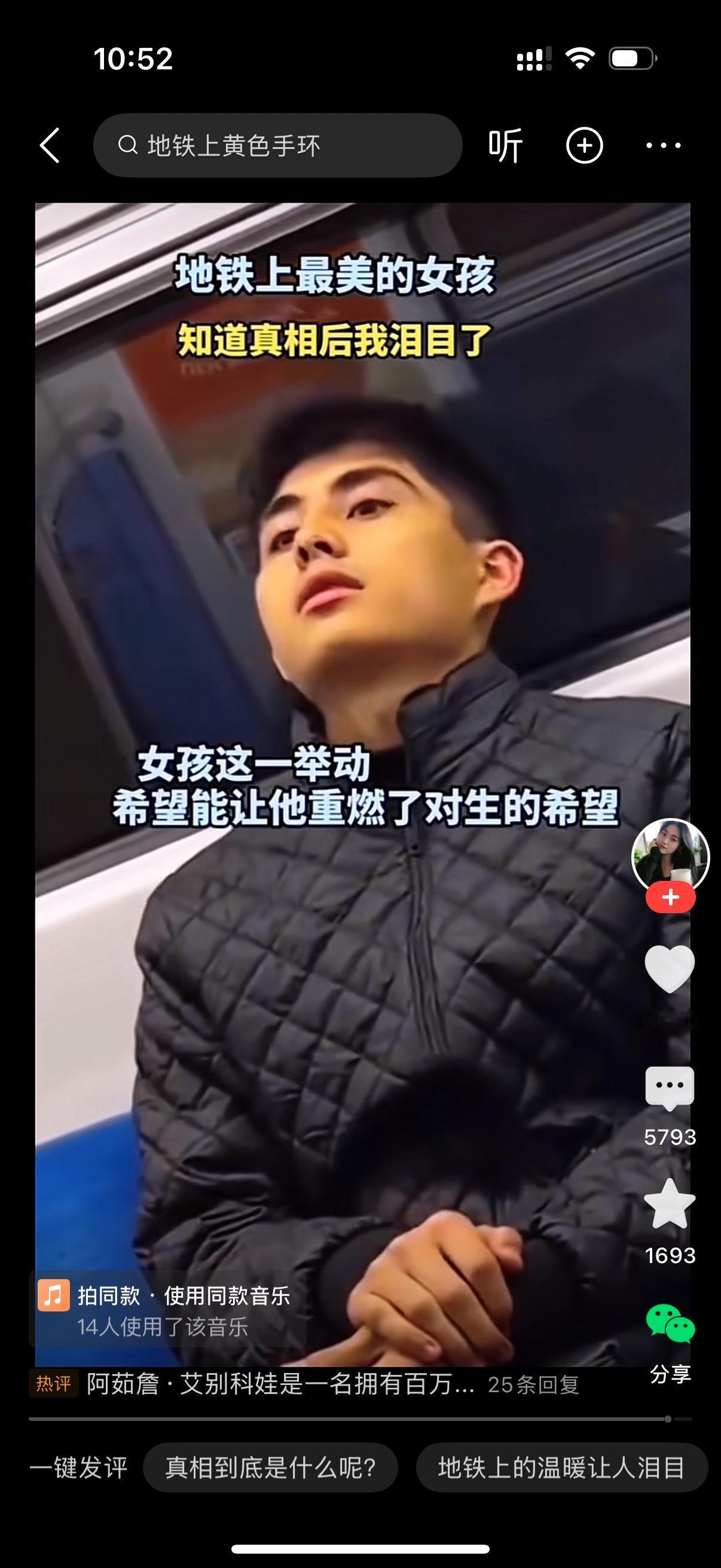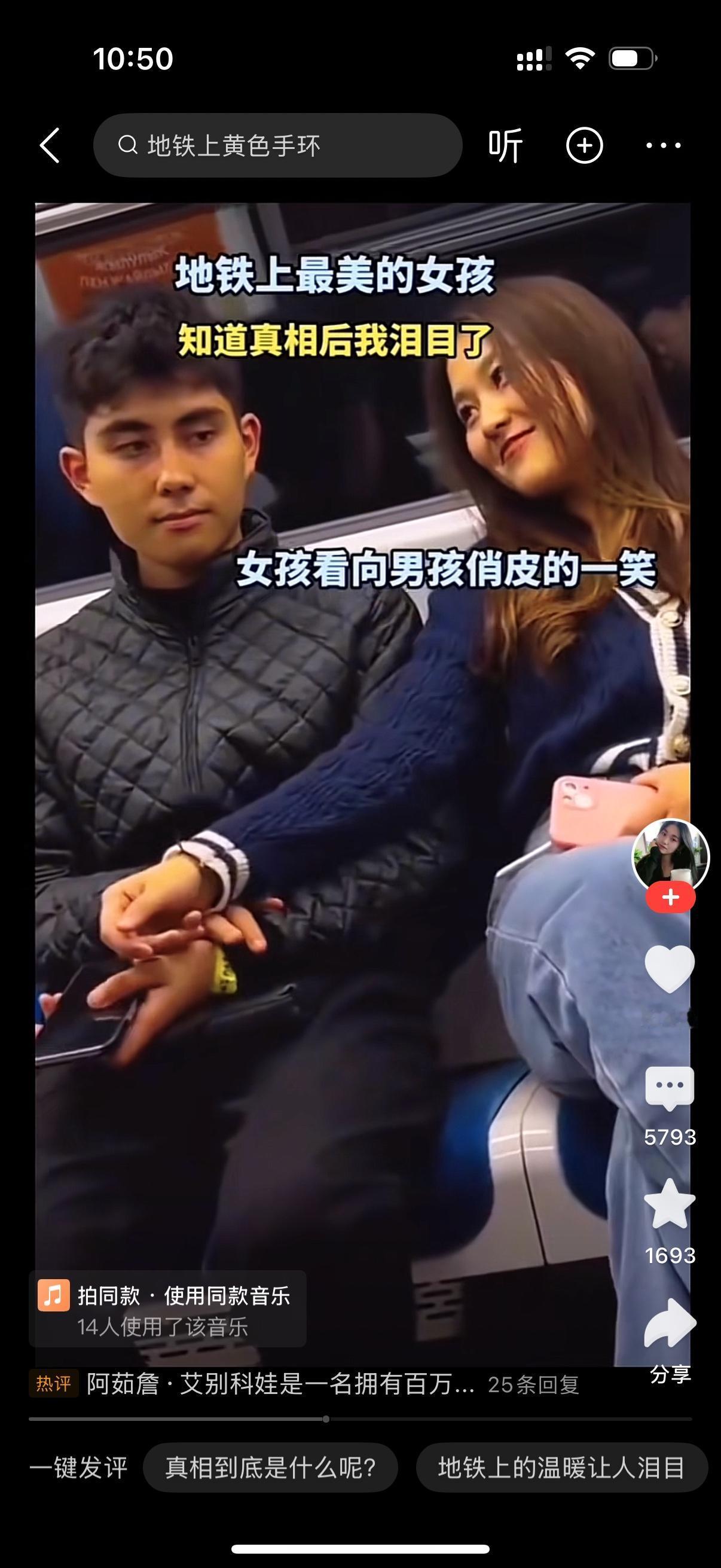 地铁上,女孩突然牵住陌生男孩的手。男孩没有抵触,他用手盖住自己的黄色手环。女孩继续握住没有放手,男孩试图挣脱女孩的手。女孩依然紧握着男孩戴着黄色手环的手,用鼓励的眼神继续看着男孩。男孩感受到女孩的鼓励微笑不语。女孩对着男孩俏皮的一笑。男孩害羞回应一笑,不敢直视女孩的眼神。地铁即将到站,女孩松开男孩的手。女孩下车了,男孩还是没有勇气,只有手上残留着女孩的体温。女孩这一举动,希望男孩能重燃对生活的希望。