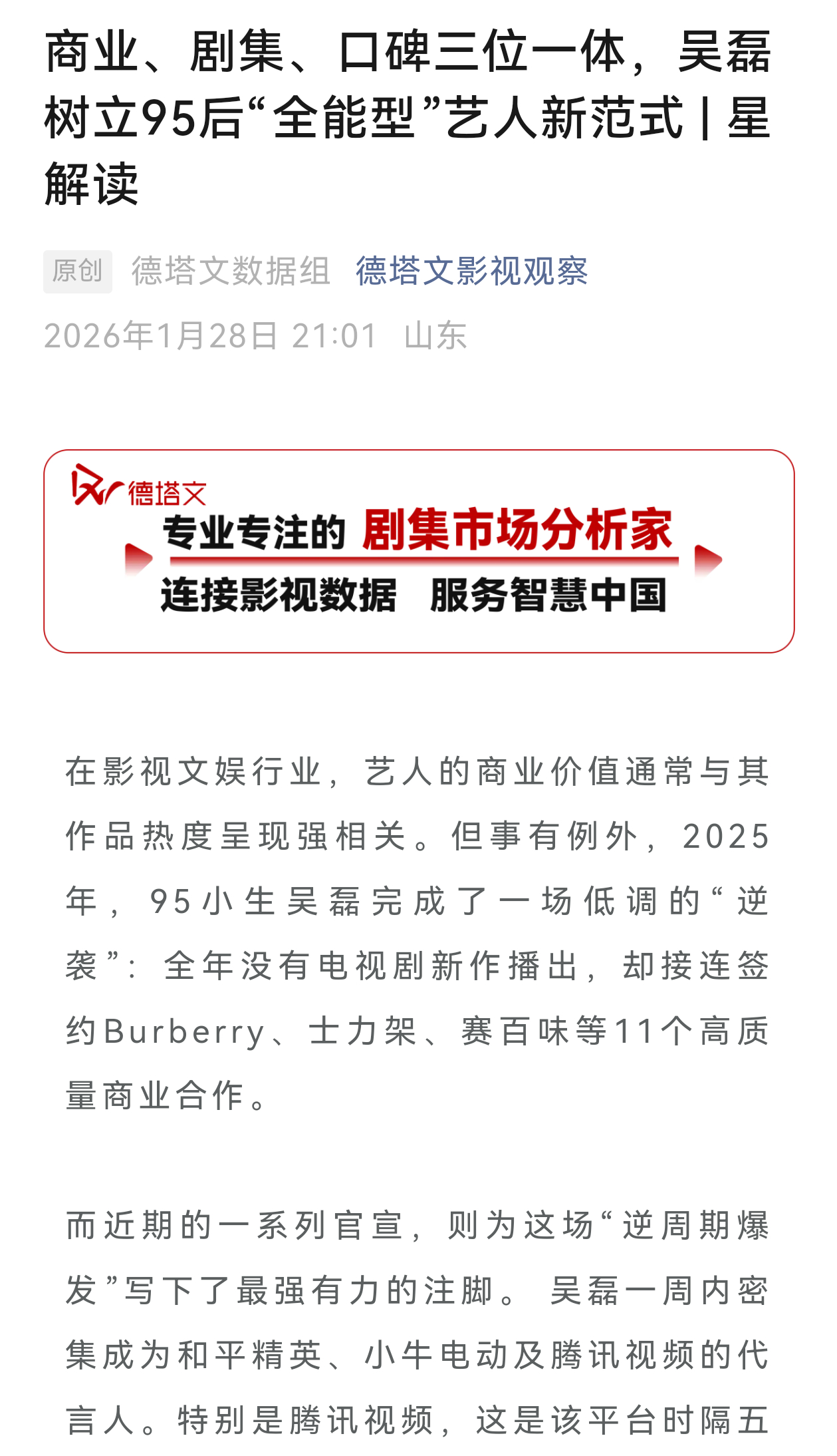 德塔文影视评价吴磊:商业、剧集、口碑三位一体,吴磊树立95后“全能型”艺人新范式🐮 媒体评吴磊逆势爆发