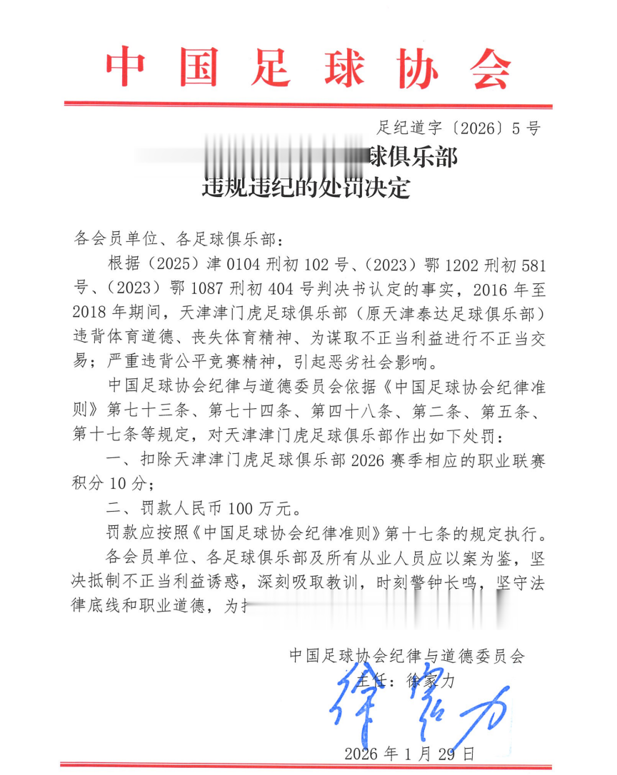 一、扣除天津津门虎足球俱乐部2026赛季相应的职业联赛积分10分;