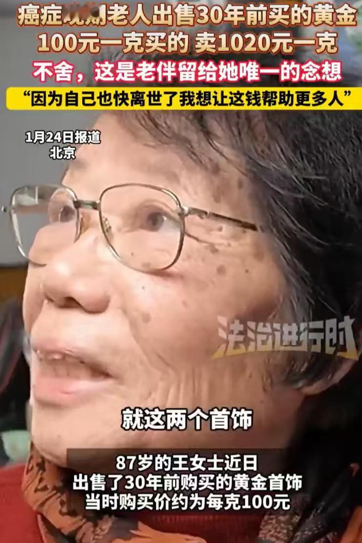 泪目!北京,一名87岁老奶奶癌症晚期,觉得自己状态不好,再加上近期金价高,就把30年前买的黄金拿出来准备卖掉,当初100元一克买的黄金,如今翻了整整10倍多,她表示虽然不舍,但想用这笔钱帮助到更多的人 - 柜台前的电子屏一阵猛跳,最后停在每克一千零二十元这个数字上,红光一闪一闪,像是在催人下决定, 屏幕下面,一双布满老年斑的手把一个旧木盒慢慢推到台面上,木盒边角磨得发白,一看就跟了主人很多年, 这里不是金融战场,而是二零二六年一月二十四日的北京,一场安静却沉重的交易正在发生, 推盒子的人叫王奶奶(化名),八十七码,结肠癌晚期,时间对她来说已经是倒计时,她心里比谁都清楚, 那天她坐了四十分钟公交车,把自己的一段人生带到了柜台前,不是为了翻身而是为了交代后事,在她心里,这不是卖金子,而是把过去换成还能继续往前走的东西, 时间往前推三十多年,那还是上世纪九十年代,金价一百元左右,对工薪家庭来说并不轻松, 她丈夫攒了大半年工资,在王府井买下这三十二克黄金,还在戒指内侧刻了两个人名字的缩写,那时候这点金子被定成家里的最后防线,只为防病防灾保命用, 后来人走了,防线还在,王奶奶却等来了癌症诊断书,化疗一次次压下来,她连站稳都很吃力, 当新闻不断说金价创新高时,她却做了个和常人相反的决定,把这道防线亲手拆掉, 她算得明白,金子留在盒子里只会跟着她一起停下,拿出来才能继续发挥作用, 出门那天她穿了件洗得发白的深蓝外套,头发梳得整整齐齐,一路把木盒抱在怀里, 那不是舍不得,而是一次正式告别,像是要把该说的话都走完流程,站到柜台前,她的动作慢却稳,没有一丝犹豫, 就在最后一步,她忽然把戒指拿回来贴在鼻尖,指腹反复摸着内侧的刻痕,那是三十多年生活留下的真实触感,是丈夫留给这个世界的痕迹,店员轻声提醒了一句,她只是摇头,眼神清亮而坚定, 交易很快完成,三十二克黄金按当天价格变现三万两千六百四十元,数字落袋却没有停留, 她没有用这笔钱给自己治病,也没有留给子女,而是直接联系了慈善机构,钱被定向送往山区,用在两个女童的学费和书本上, 这是原本属于一个家庭的私房钱,如今成了两个陌生孩子继续读书的支撑,她记得丈夫说过能帮人就别推辞,于是用最彻底的方式照做,金子被剥离了形体,却把精神留了下来, 现在的王奶奶仍在忍受病痛,身体一天比一天虚弱,结局早已写好,但那块金子并没有消失,它只是换了个去处继续发光,在这个冬天,它变成了远方课桌上的一束亮光。