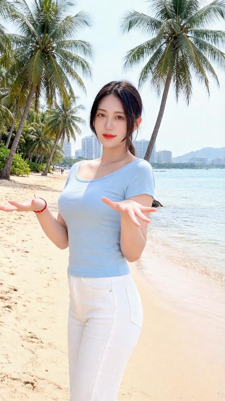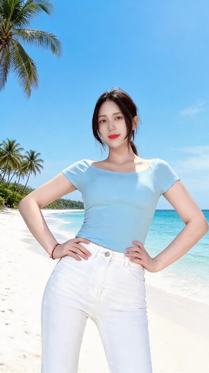 沙滩上的清新美女,蓝白相间的穿搭,阳光明媚,海风轻拂。海边女神穿搭