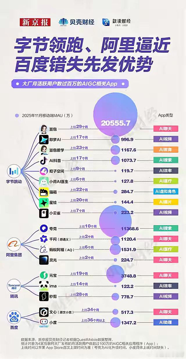 大厂AI争夺战白热化,谁在赛道中渐显掉队? 2026年AI赛道竞争进入深水区,大厂凭借资源优势分野明显,字节、阿里、腾讯形成第一梯队,百度先发优势弱化,中小创企加速分化,赛道格局正在重塑。BCG数据显示,2026年全球AI投资将翻倍,94%企业即便短期无回报仍坚持投入,巨头与中小玩家的资源鸿沟进一步拉大。 字节以内生孵化领跑用户端,豆包月活率先突破2亿,即梦AI等多款产品跻身百万级月活,“内部赛马+生态推流”模式快速完成商业闭环。阿里通过全生态接入奋起直追,千问App两个月月活破千万,蚂蚁阿福上线半年月活超1500万,远超字节同期医疗AI产品,应用侧推进速度迅猛。腾讯则靠“投资+生态”双线布局,投资14家AI企业,元宝App月活达3748万,借微信生态构建差异化优势。 反观百度,虽最早入局却未能放大先发优势,文心助手相关产品月活仅517万,在红包大战等用户争夺中动作迟缓,产品迭代与生态整合节奏滞后于头部玩家。 行业分化加剧,748个备案大模型中行业大模型占比达88%,基础模型向头部集中。投融资端收缩,2025年赛道投资金额腰斩,DeepSeek开源让中小厂商难以立足基础研发,零一万物等创企转向细分场景。基础模型能力仍是核心壁垒,头部厂商持续投入算力与数据优化,中小玩家只能在垂直领域寻找生机。 大厂AI竞争格局 AI行业分化 赛道从来不是比谁起步早,而是比谁能精准踩中生态、技术与用户的三重节奏。