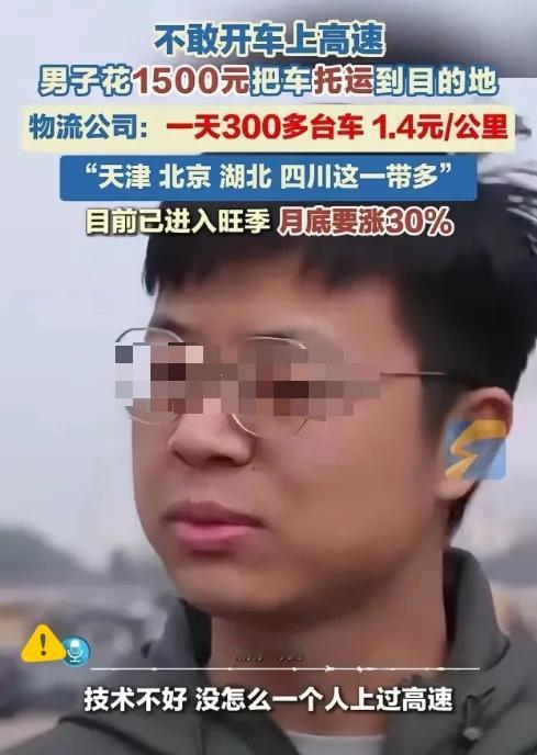 “人怎么能这么聪明!”浙江,一男子想回老家,但是又不敢开车上高速,于是他灵机一动,花1500元让人把车托运回老家。网友:我怎么没想到? 可细算下来才发现账根本不是这么算的。800公里的路程,自驾油费加过路费撑死800块,就算找朋友搭把手还能唠嗑解闷,结果大哥托运加自己的高铁票,里外里快2000块花出去了,妥妥的多花冤枉钱。 但这事儿也不能全说大哥笨,他的聪明其实是藏在安全里,不敢开高速硬上才是真的危险,花钱买安心,说到底也是一种选择。 生活里很多事都是这样,看似不划算的决定,背后都有自己的考量,省钱和舒心从来都难两全。大家遇到这种情况,会选省钱的自驾还是花钱的托运呢?