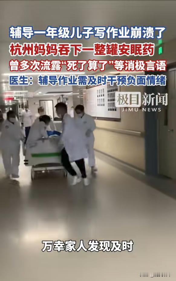 “被逼坏了!”1月26日,浙江杭州,一女子辅导儿子作业时,因一道题反复讲了许多遍仍不会,情绪突然失控,竟直接吞下一整罐安眠药,随后昏迷不醒,家人发现后急忙送去医院,费了好一番功夫才脱离危险。 据了解,这位妈妈当天晚上陪着儿子写作业,一道不算特别难的题,她耐着性子讲了一遍又一遍,可孩子始终似懂非懂,怎么都学不会。 没人知道那一刻她心里有多崩溃,只知道情绪失控的瞬间,她转身拿起家里的整罐安眠药,一股脑全吞了下去,随后就陷入了昏迷。 等家人发现的时候,她已经意识模糊,喊也喊不醒,一家人吓得魂都没了,连滚带爬地拨打了120,火急火燎地把她送到了医院。 医生接到人后,立刻展开了全力抢救,洗胃、输液,一系列紧急措施下来,终于从死神手里把她拉了回来,目前她还在医院恢复,万幸没有生命危险。 很多人看到这件事,第一反应不是指责,而是深深的共情,尤其是同为家长的人,更是懂这种崩溃到极致的感觉。 其实这位妈妈并不是脾气不好,更不是矫情,了解过后才知道,她多年前生完孩子后,就患上了产后抑郁,一直靠着吃药勉强控制着情绪。 后来孩子上了幼儿园,她的情绪慢慢平稳了下来,本以为日子会越来越好,可随着孩子长大,开始上学,她又陷入了新的焦虑。 天下父母都盼着孩子能好好读书,她也不例外,可孩子的成绩一直达不到她的预期,越着急越上火,焦虑感就像潮水一样,一次次将她淹没。 加上临近期末考试,作业量比平时多了不少,白天要照顾家里,晚上还要熬夜辅导作业,长期的疲惫和压抑,早就让她的情绪到了临界点。 那天晚上的那道题,就像是一根导火索,一下子点燃了她积压已久的负面情绪,脑子一热就做了傻事,现在想想,连她自己恐怕都觉得后怕。 可能有人会说,不就是辅导个作业,至于吗?可只有真正经历过的家长才知道,那种无力感有多磨人。 你以为很简单的知识点,翻来覆去讲十几遍,孩子还是一脸迷茫,耐着性子的最后,就是忍不住的暴躁,血压飙升都是常有的事。 尤其是对于本身就有情绪问题的人来说,这种压力更是雪上加霜,产后抑郁从来都不是“熬一熬就过去”的小事,它就像一个隐形的枷锁。 哪怕平时看起来和正常人一样,也可能因为一点小事就情绪崩溃,而家人的理解和分担,往往是她们对抗抑郁的最大力量。 在这里也想跟大家说句实在的,产后抑郁不是矫情,是需要被重视、被理解的心理问题,哪怕情绪已经平稳,也不能掉以轻心。 如果感觉自己情绪不对,别硬扛,多跟家人说说心里话,也可以适当给自己放个假,哪怕只是一个小时,也能缓解不少压力。 还有辅导孩子作业这件事,我们一定要摆好心态,每个孩子的接受能力不一样,成长节奏也不同,没必要逼孩子,更没必要逼自己。 如果情绪快要失控的时候,不妨按下暂停键,离开房间透透气,或者喝杯水冷静一下,告诉自己,一道题而已,没必要跟自己、跟孩子较劲。 家人之间也要多一份体谅,爸爸多主动分担一点辅导作业、照顾家庭的责任,妈妈就少一份压力,少一份崩溃。 万幸这位杭州妈妈被及时救了回来,没有造成无法挽回的后果,这也给所有家长提了个醒,焦虑可以有,但千万别做傻事。 孩子的成长是一场漫长的旅程,不需要我们一路狂奔,慢慢来,多一点耐心,多一点包容,既是放过孩子,也是放过我们自己。 信息来源:《辅导一年级儿子写作业崩溃了,杭州妈妈吞下一整罐安眠药,曾多次流露“死了算了”等消极言语,医生:辅导作业需及时干预负面情绪》极目新闻